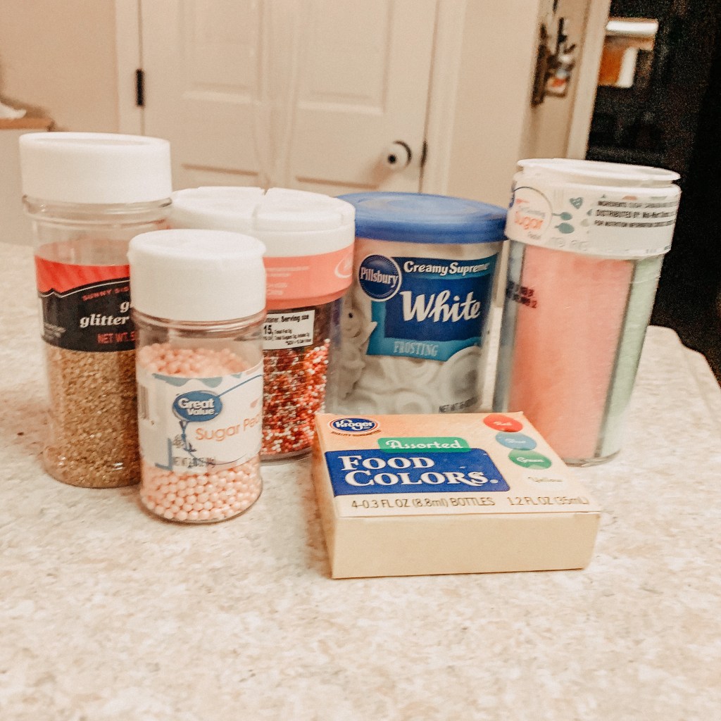 - Mix food coloring with white frosting in separate cups to make your desired colors. In this instance I created pink and purple frosting and left some white.