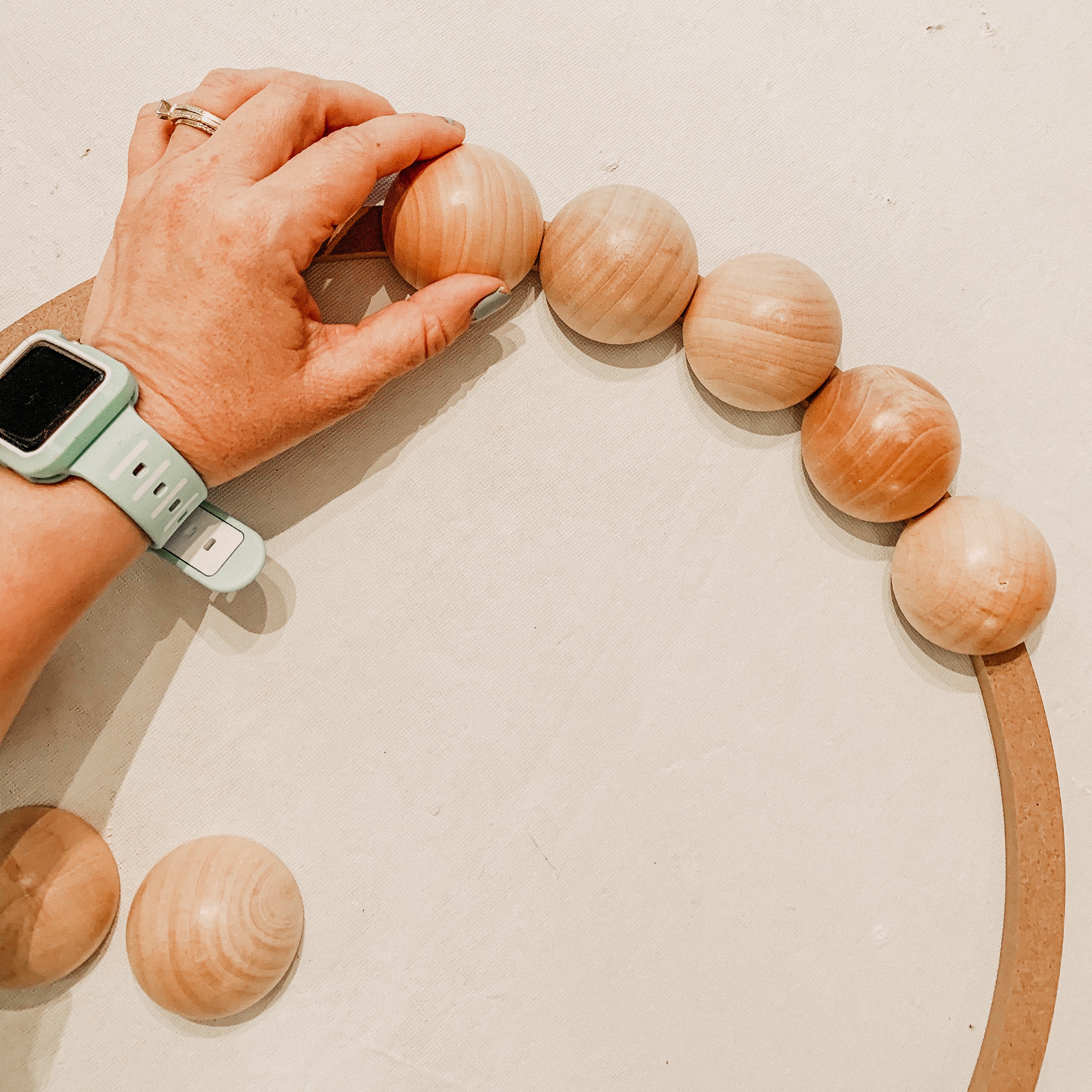Start by gluing each of the split wood balls to the wreath form. Continue this until the wreath is about 2/3 covered or you use 16″ balls.