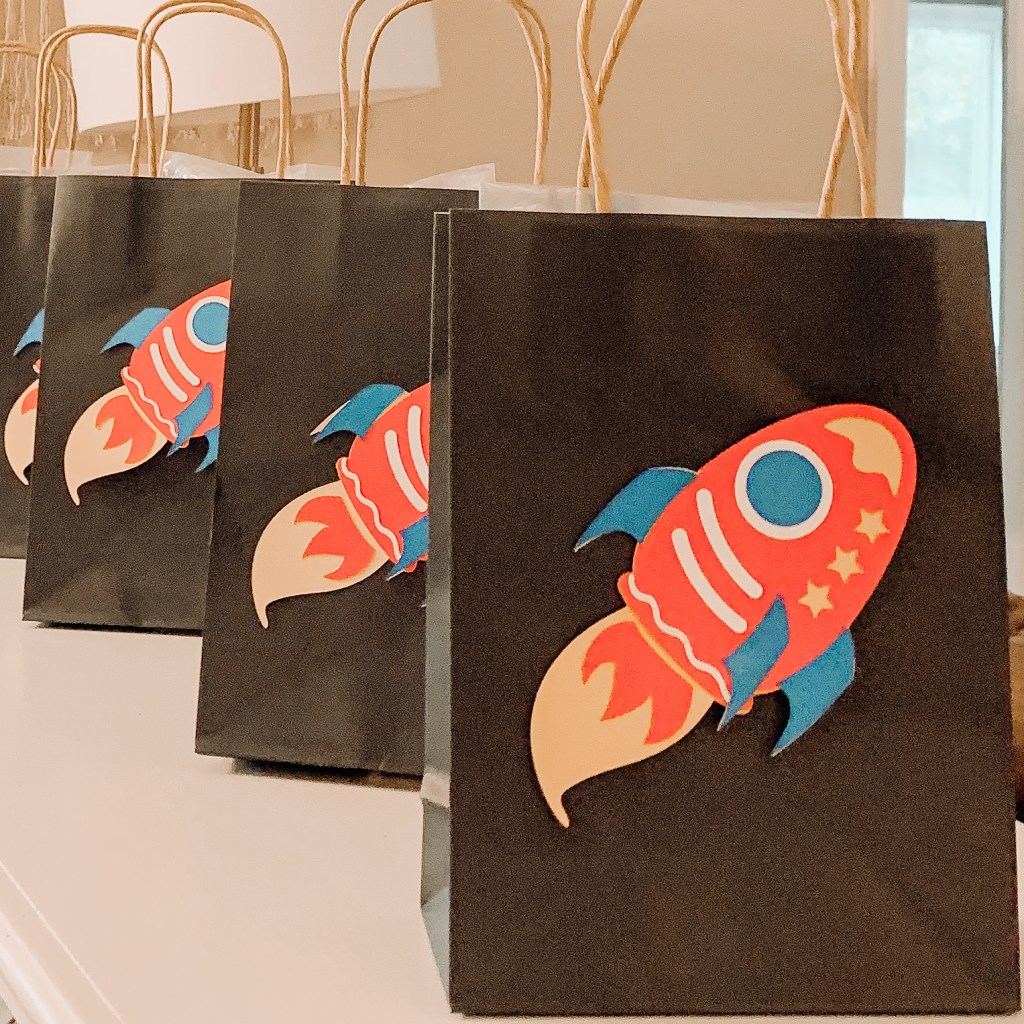 One thing I am always sure to do as a host is to provide a gift bag or party favors to my guests. I know most of the contents end up being tossed a few days later, but it is an extra way for me to show thanks for their attending and being part of our lives in general. For Hank’s party I used navy blue gift bags and added a rocket ship cut out to the outside of the bag. The bag’s contents included: alien tattoos, space rings, space bracelets, space stickers, space pencils and a space-themed paddle ball toy!