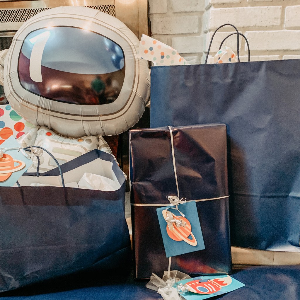 I’ve never done this before but I decided to coordinate Hank’s gifts from me and Nick to match is theme. I wrapped them in navy blue wrapping paper and each one had a cute little space tag. It was super easy to tell which gifts were from us and also for my parents to give me the look that silently tell me “he is spoiled”, hahaha.