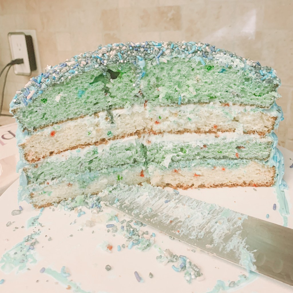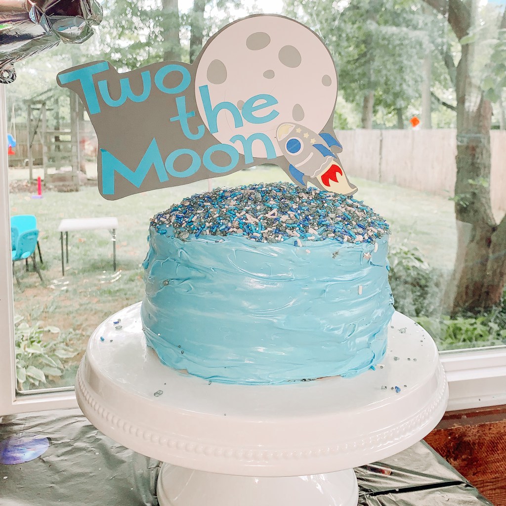 I don’t fancy myself a cake artist by any means but I am pretty impressed with how well this four-layer space cake turned out! I used two boxes of Pillsbury Funfetti cake mix and two cans of Pillsbury vanilla frosting to make this masterpiece. I dyed one box of cake batter blue with blue food coloring, and left the other box white. I used 9-inch round cake pans and even “leveled” off the tops of each cake so it wouldn’t be lopsided. I colored the frosting blue with an obscene amount of blue food coloring and then frosted and layered the cakes in alternating colors. When I finished frosting the cake (and stopped Lennon from dying herself blue with what was left of the blue food coloring) I topped it off with custom outer space sprinkles from BrookieSprinkles (Etsy) and a Two the Moon cake topper my mom made with her Cricut!