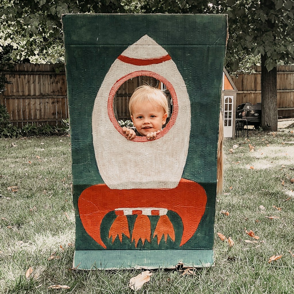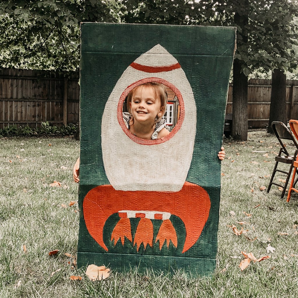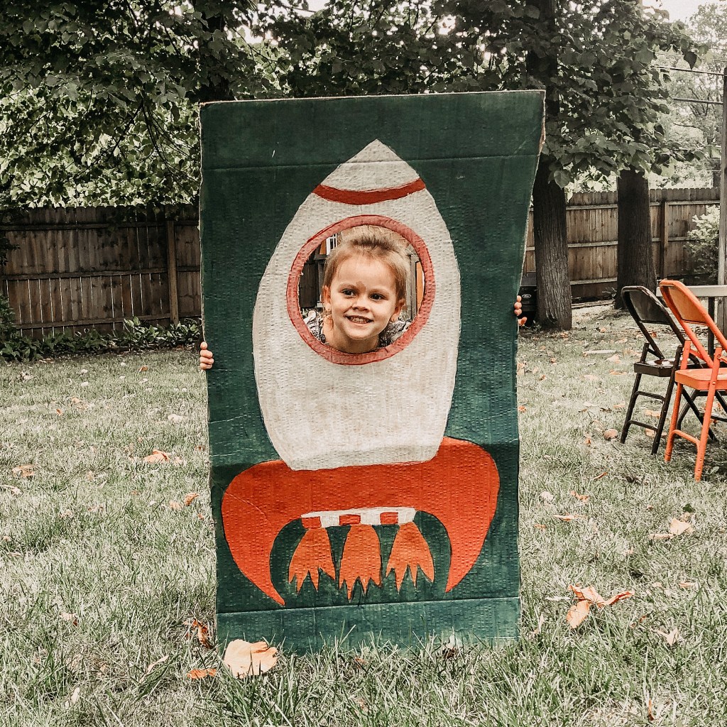 This was a last-minute, morning-of project. I am normally not a procrastinator and I had big plans to make this over a month ago and then never got to it. So, the morning of the party my guilt set in and I dug through our garage for a piece of cardboard big enough to make a rocket ship. I grabbed my kids poster paint and got to work. A couple hours and a few spills later I had this beautiful rocket ship photo “thing” (do these things have a name) that I was pleasantly surprised with because if there is one thing I am NOT, it is an artist! The kids and the adults had fun with this one.