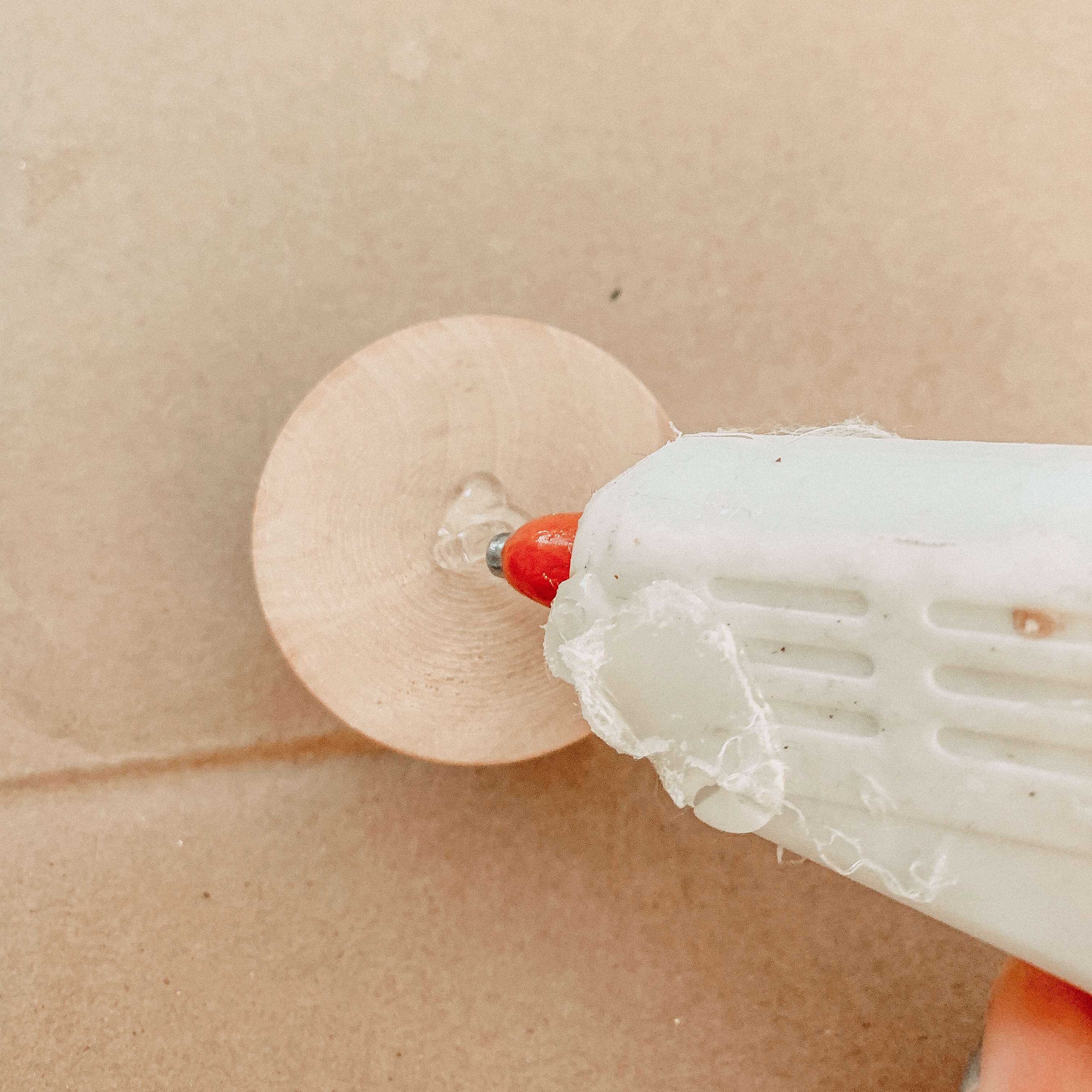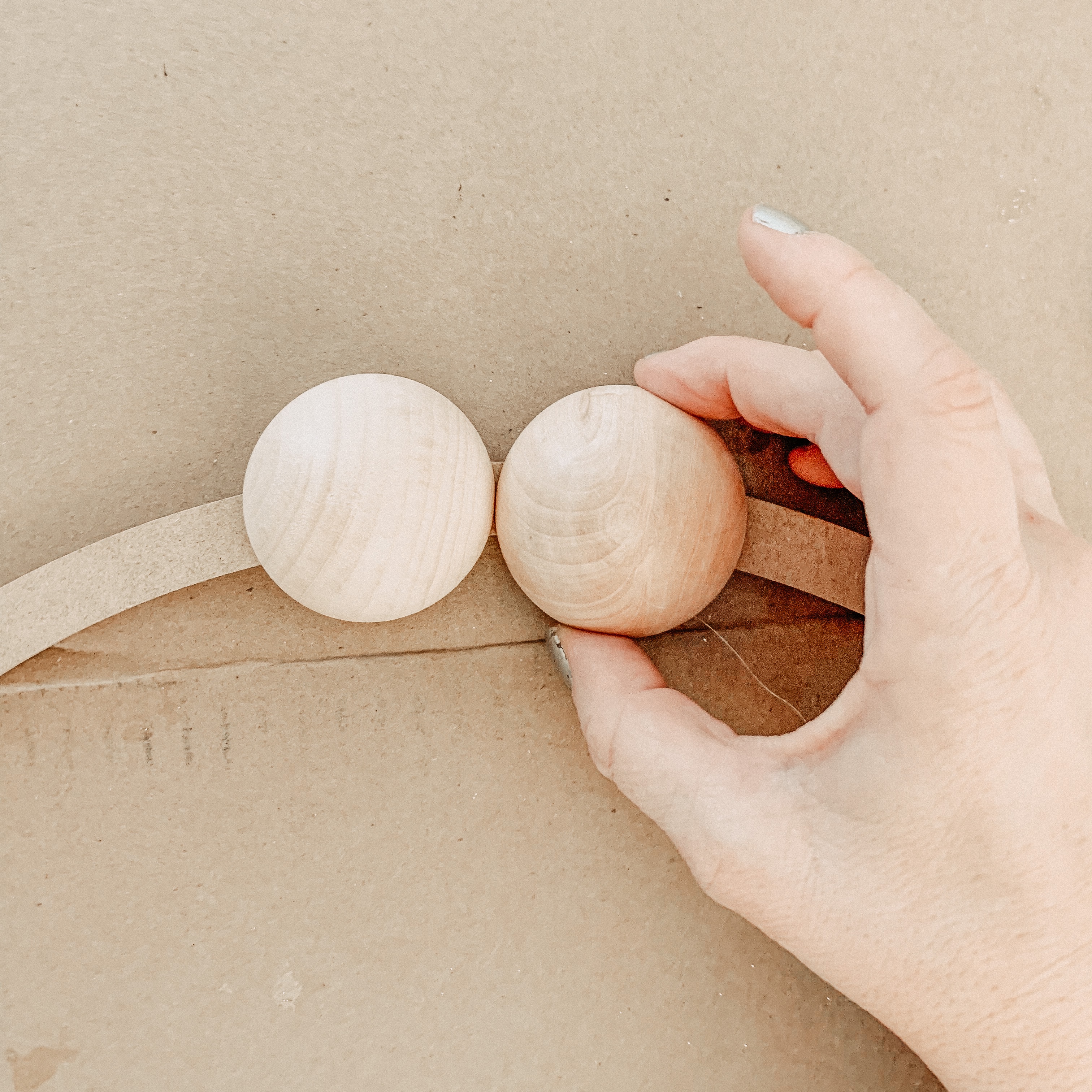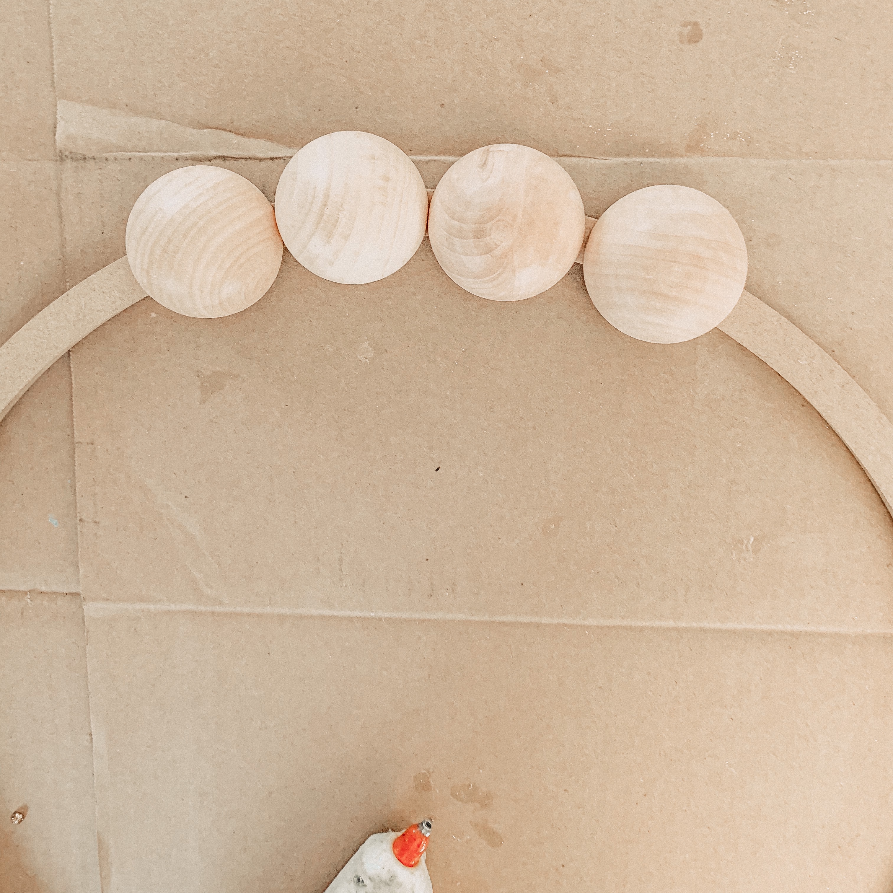 Start by gluing your wood balls to the embroidery hoop with hot glue. Place them next to each other and keep adding until the hoop is about 2/3 covered.