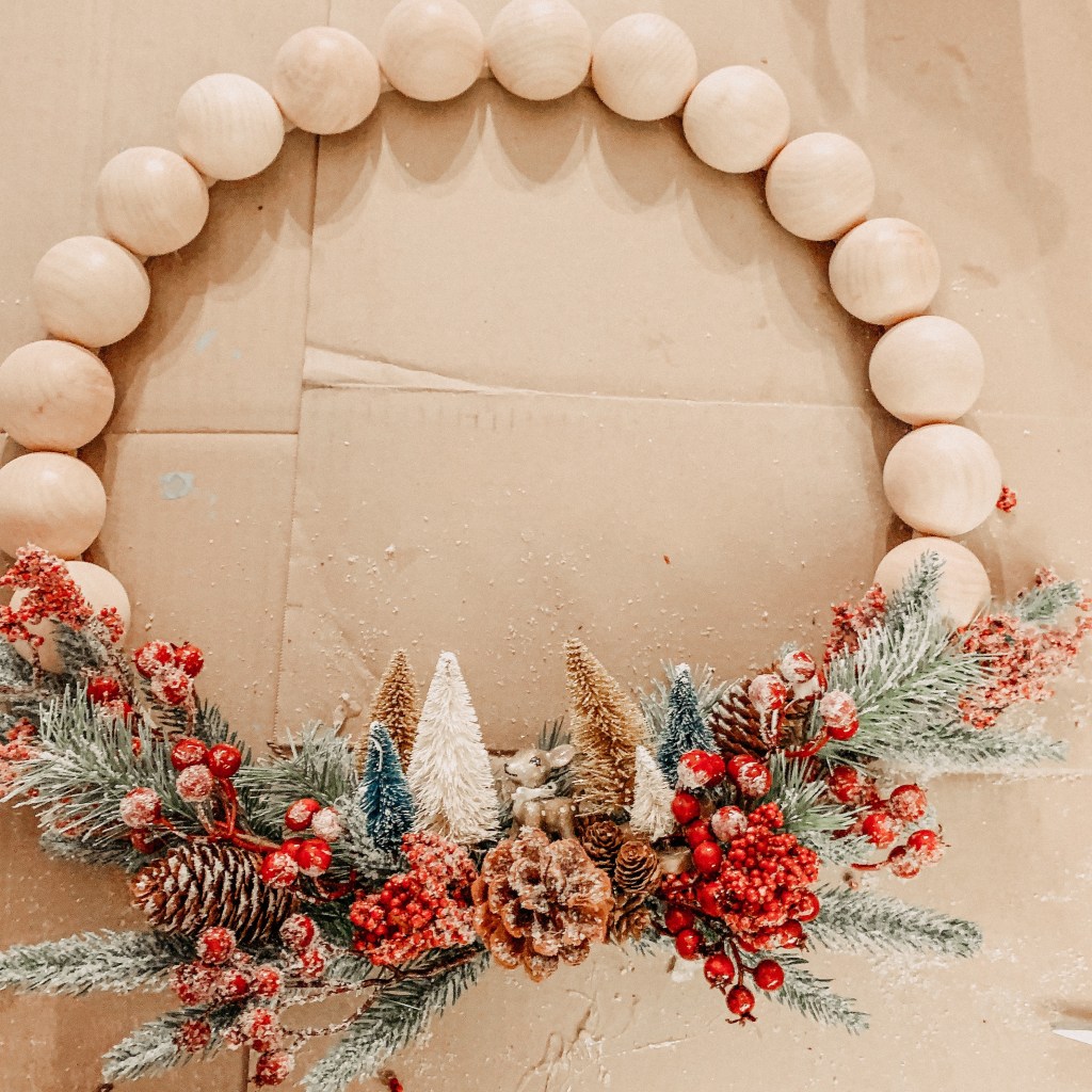 I just LOVED my Summer Wood Bead Wreath so much that I had to make a holiday version. The wooden beads paired with the winter greenery and vintage deer ornament is the perfect mix of whimsical and woodland. Isn’t it gorgeous?!