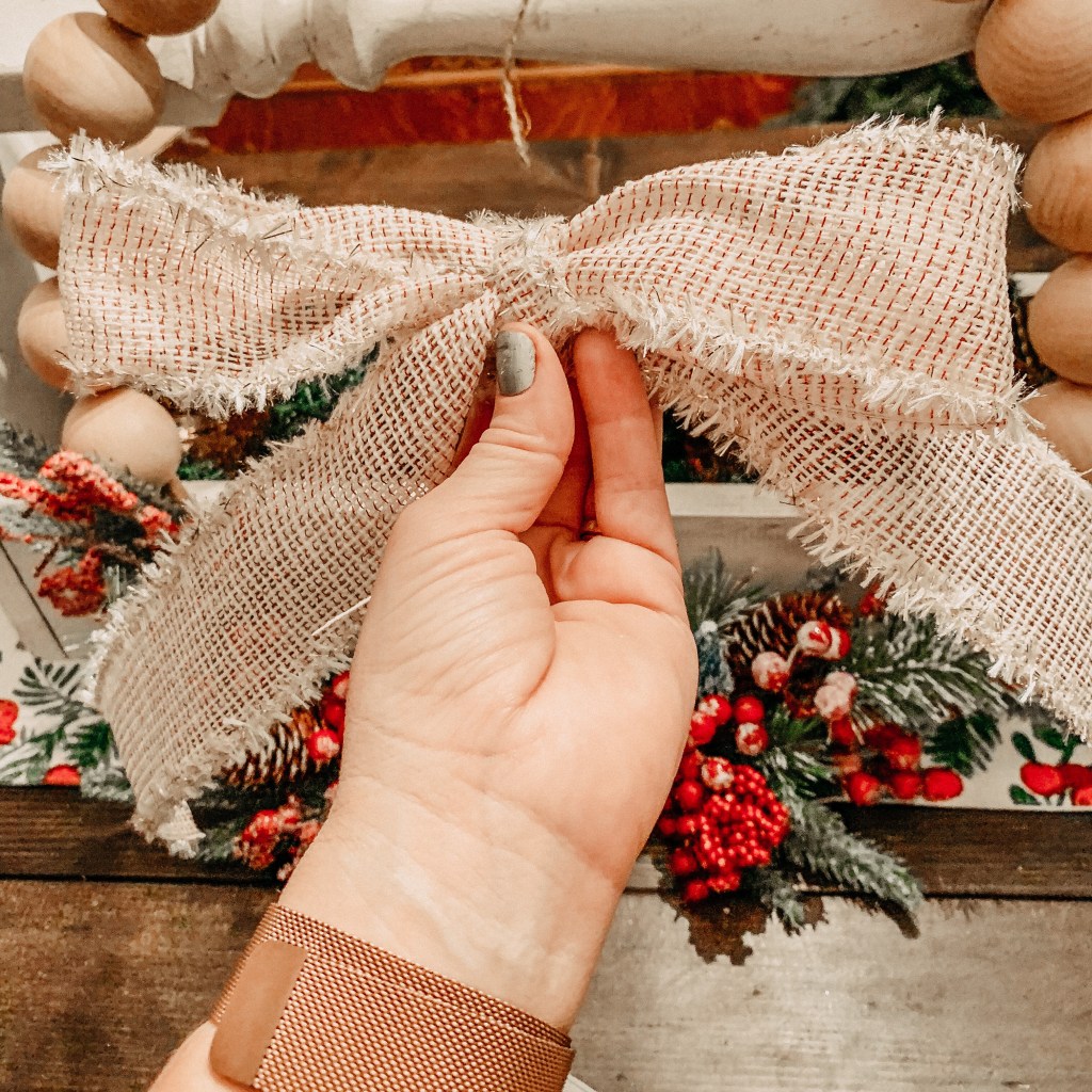 Tie the ribbon or burlap into a big bow between two balls at the top and center of the wreath.
