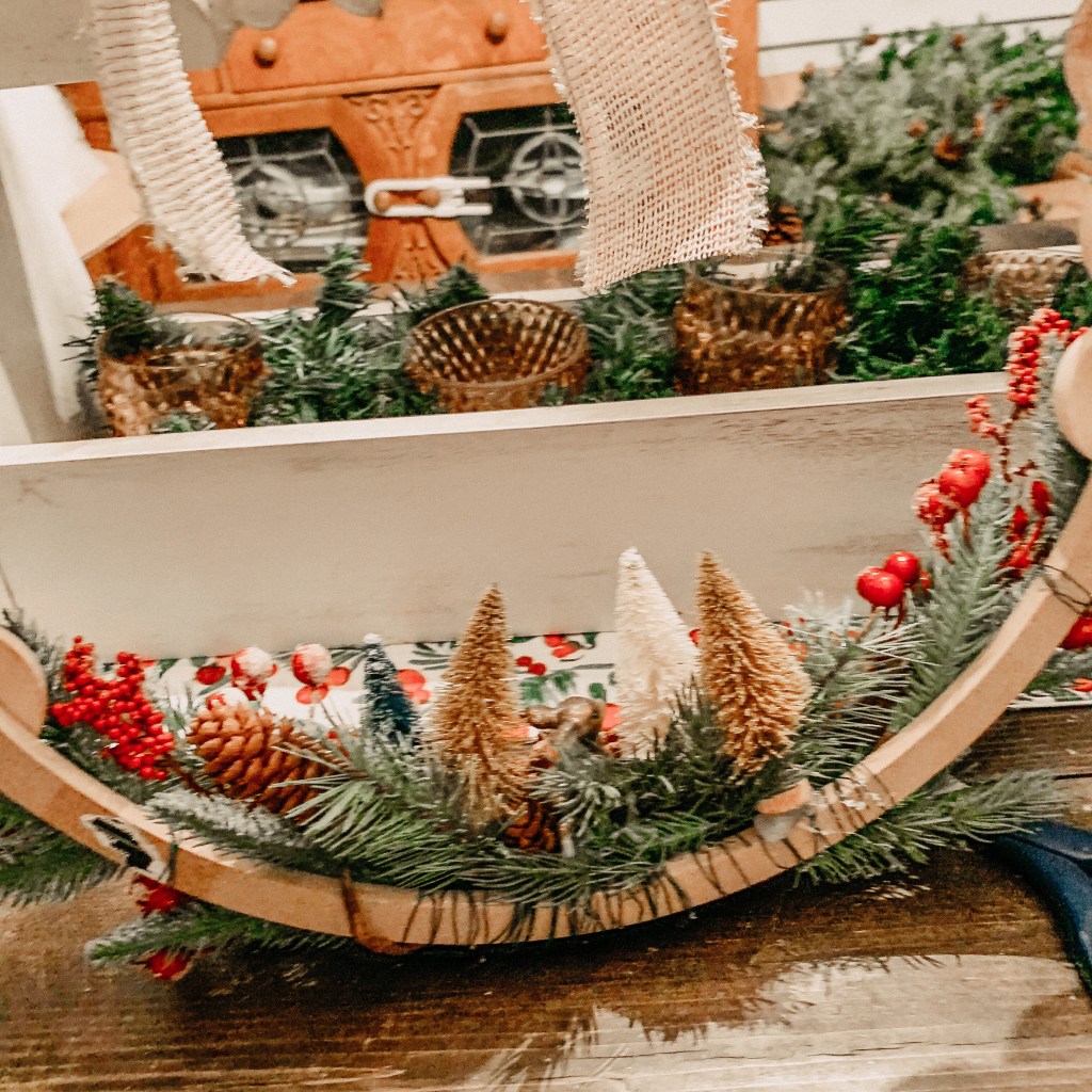 Once the bottom is covered in greenery, add some bottle brush trees and the deer using hot glue. Arrange them however you’d like. Get creative with colors!