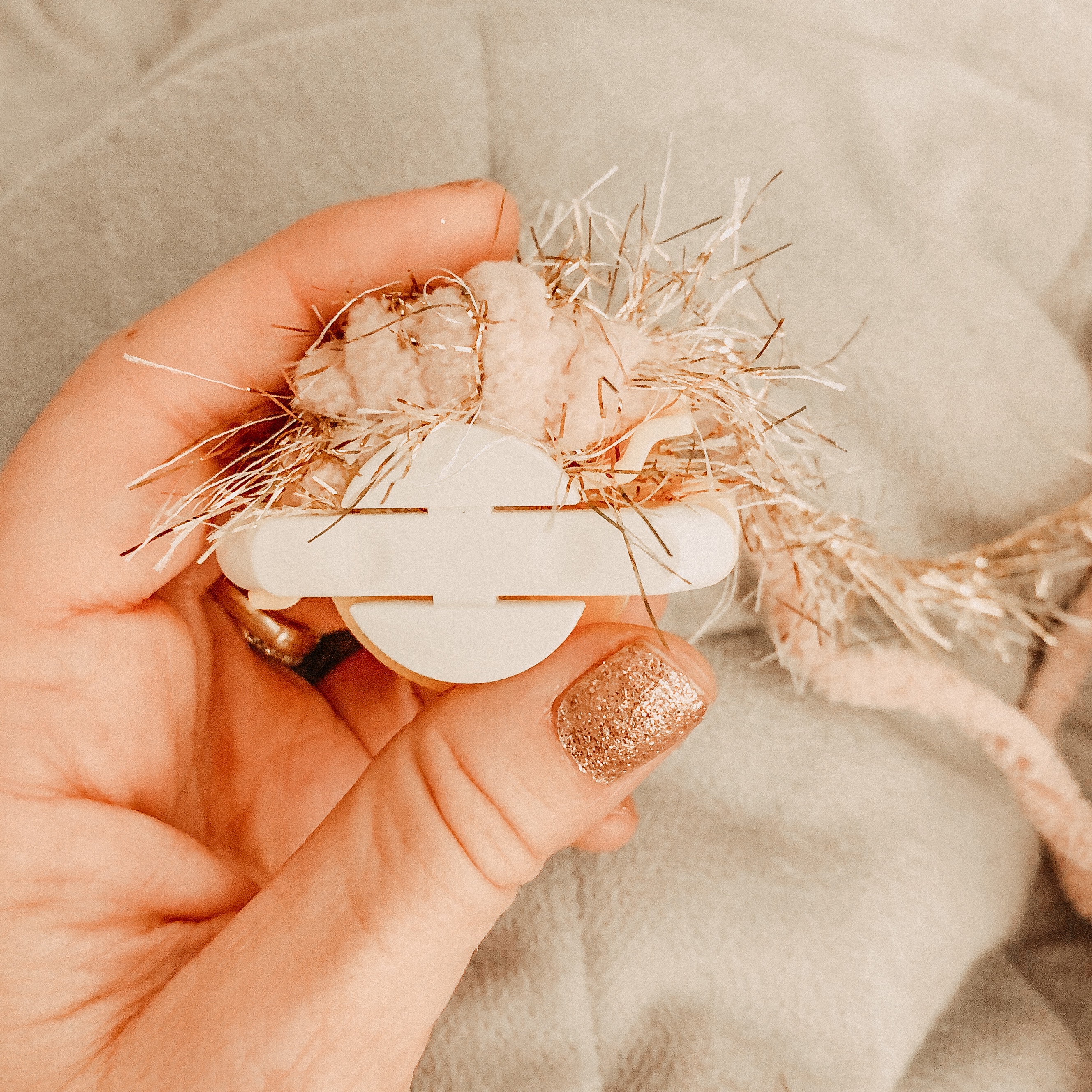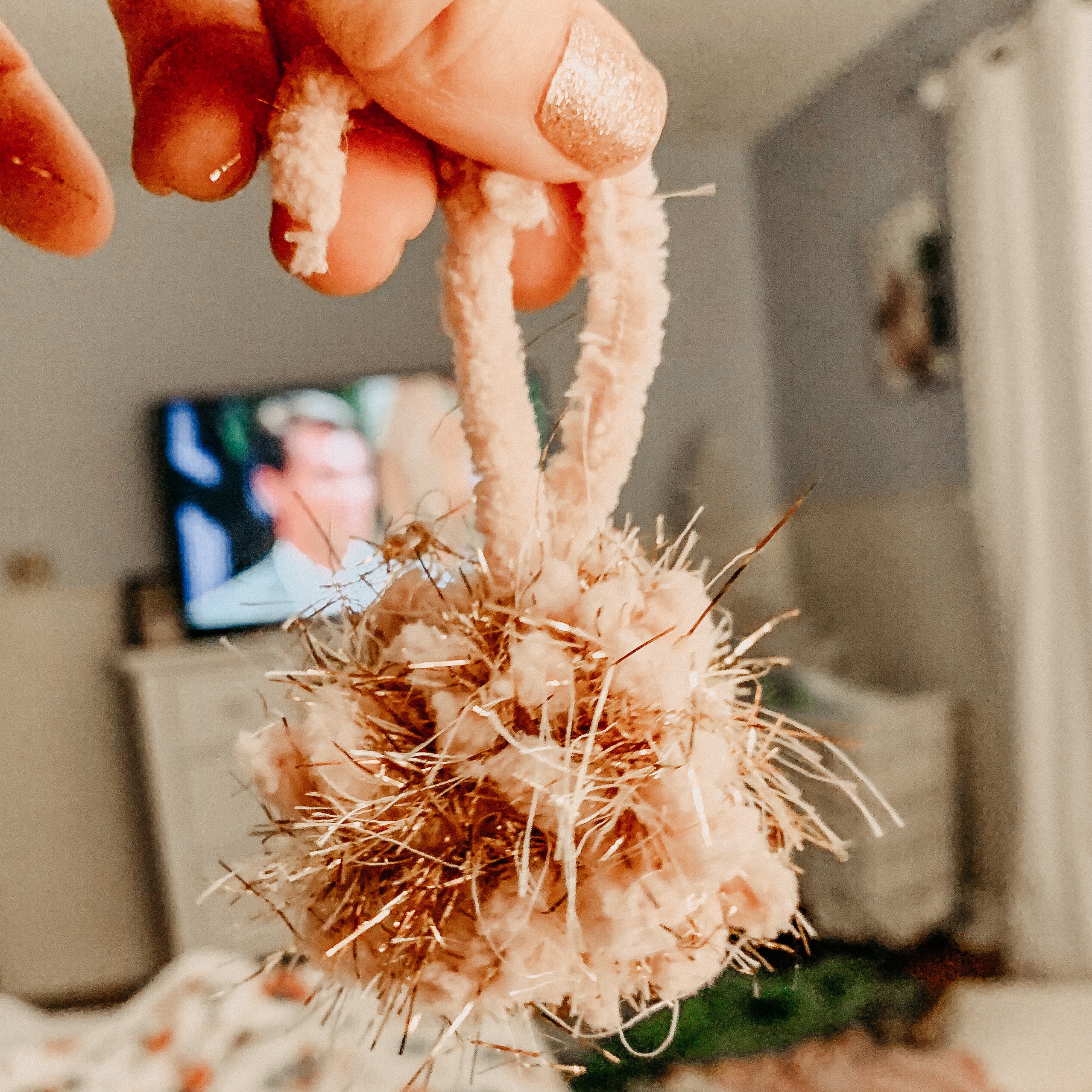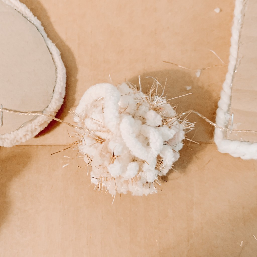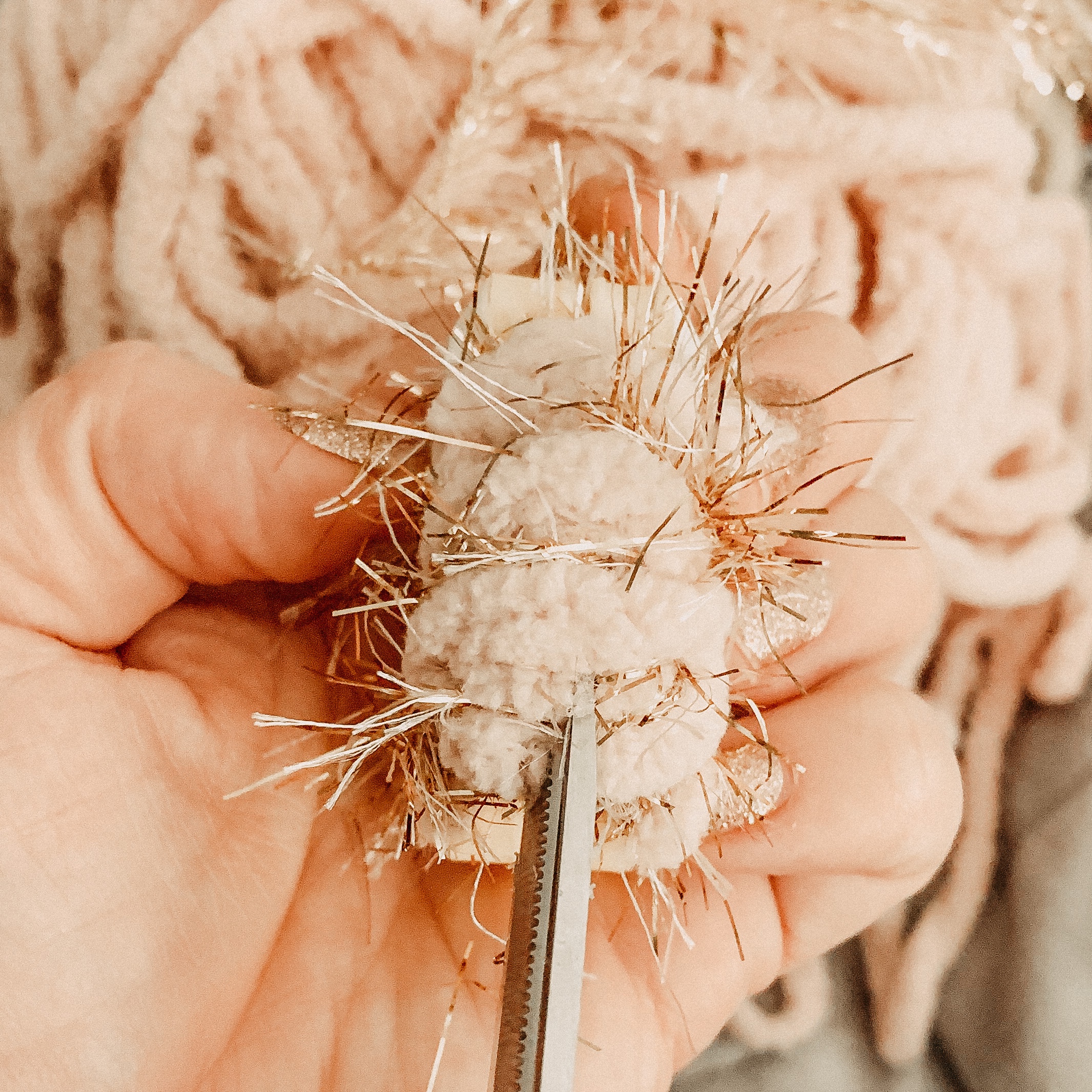 Make some yarn pompoms with the same yarn. I added in some sparkly yarn, as well.