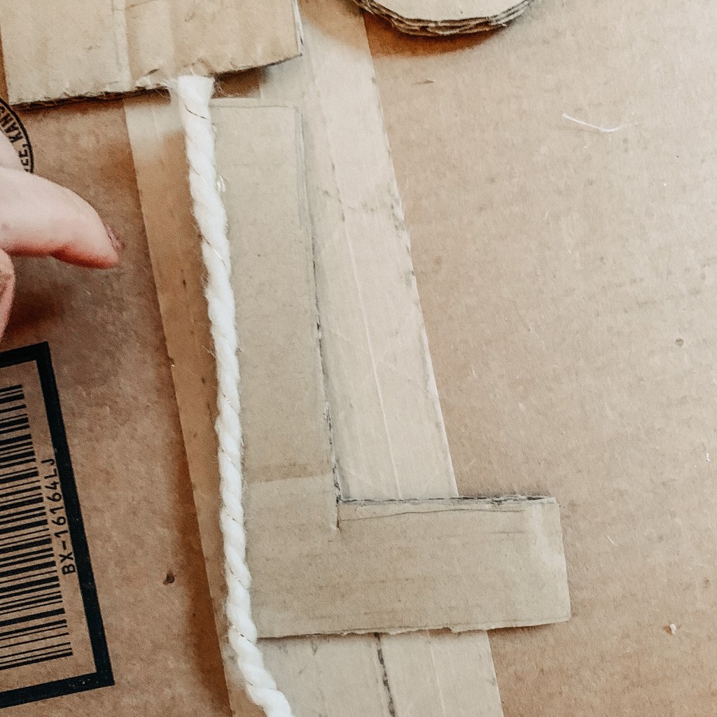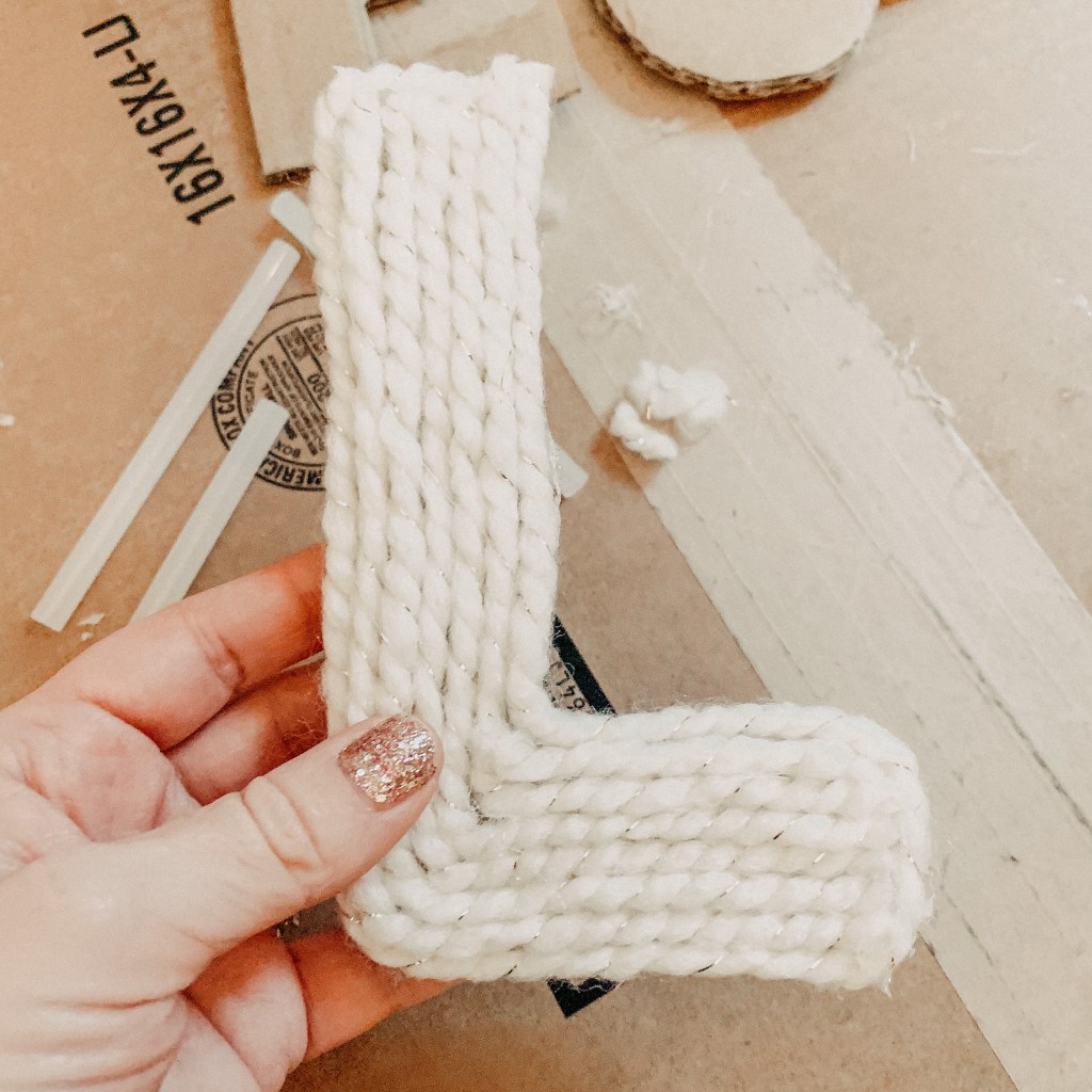 Continue adding yarn to the cardboard with hot glue until the letter is completely covered. I started with the top of the letter and then went around the edges to finish it off.