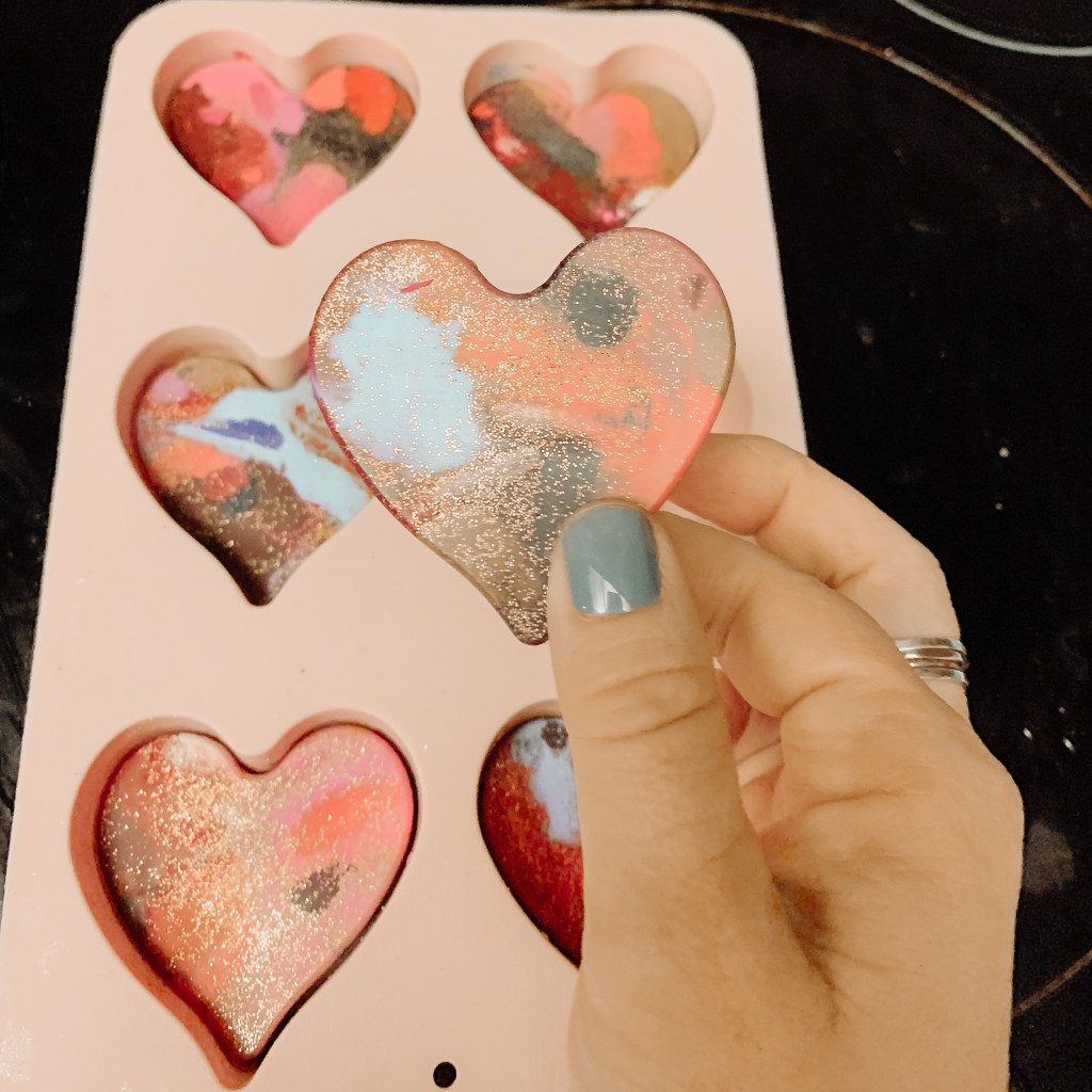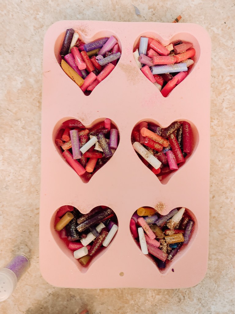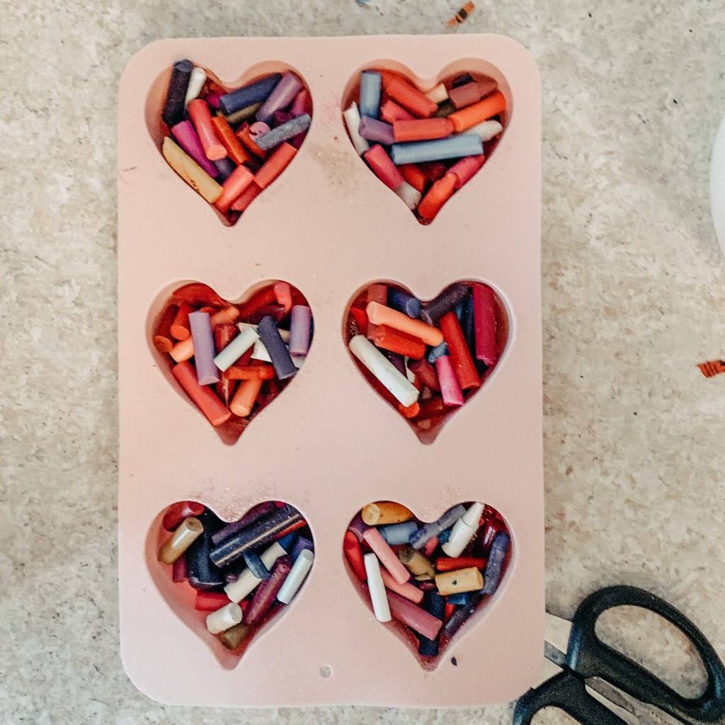 Fill each heart mold with crayon pieces.