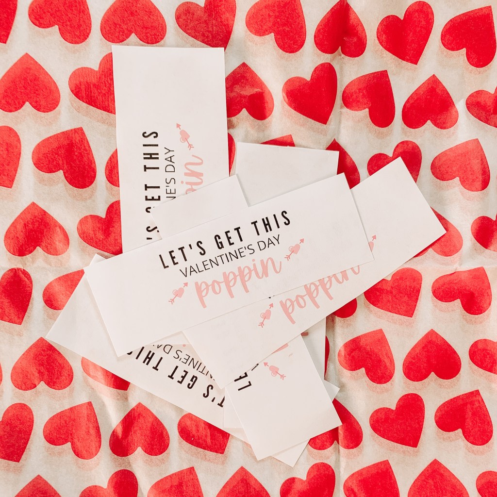 Cut your Valentine quote/message down to size. I think mine were approx. 2”x3”. I chose the message “Let’s get this Valentine’s Day poppin” because it was a witty play on words, IMO. I designed the message using Canva. If you don’t use Canva I highly recommend starting now. I use the free version and it is amazing.
