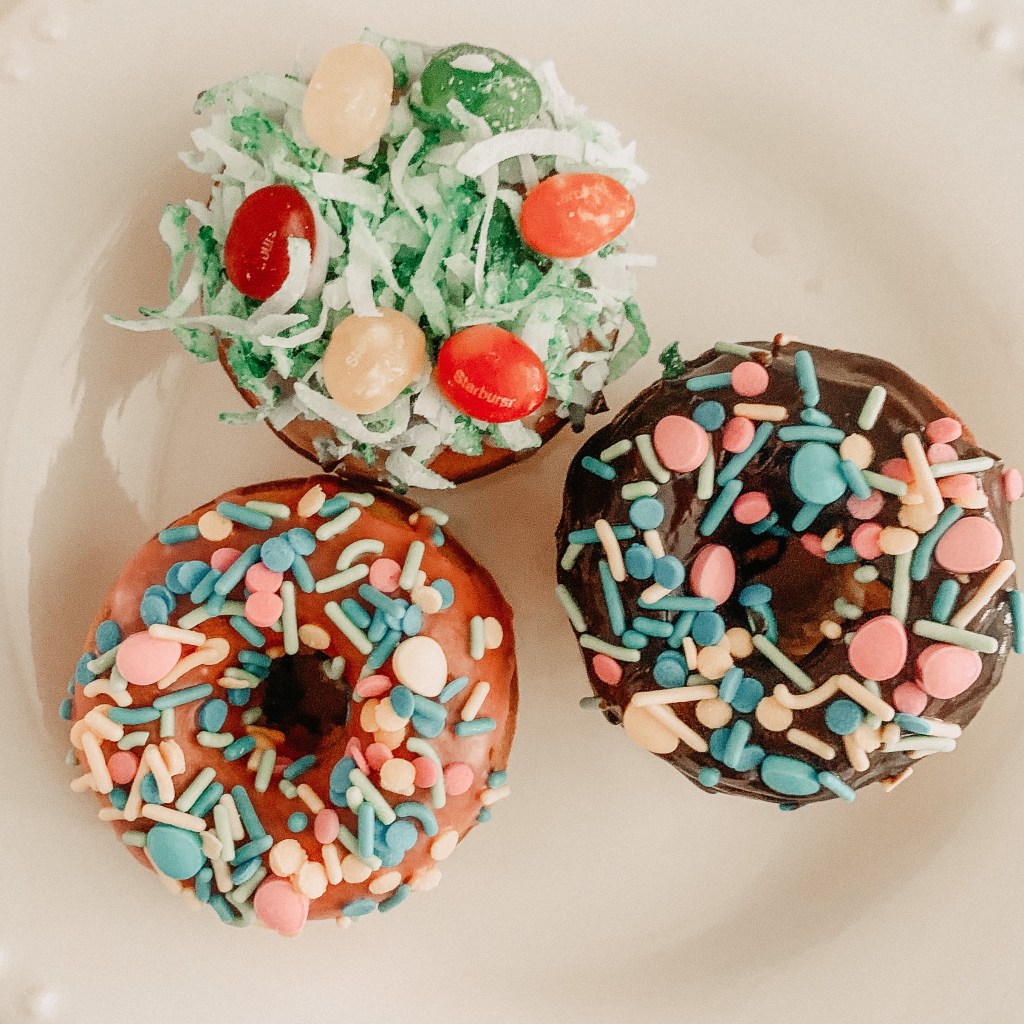 Spread vanilla glaze onto donuts and then sprinkle green coconut on top of the glaze. Add a few jellybeans to look like Easter eggs and enjoy!