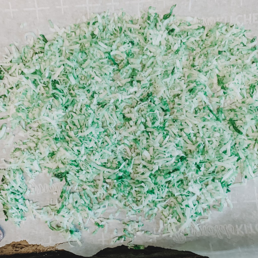 Put coconut into Ziploc bag and add a few drops of green food coloring. Seal the bag and mix coconut around until it turns green.