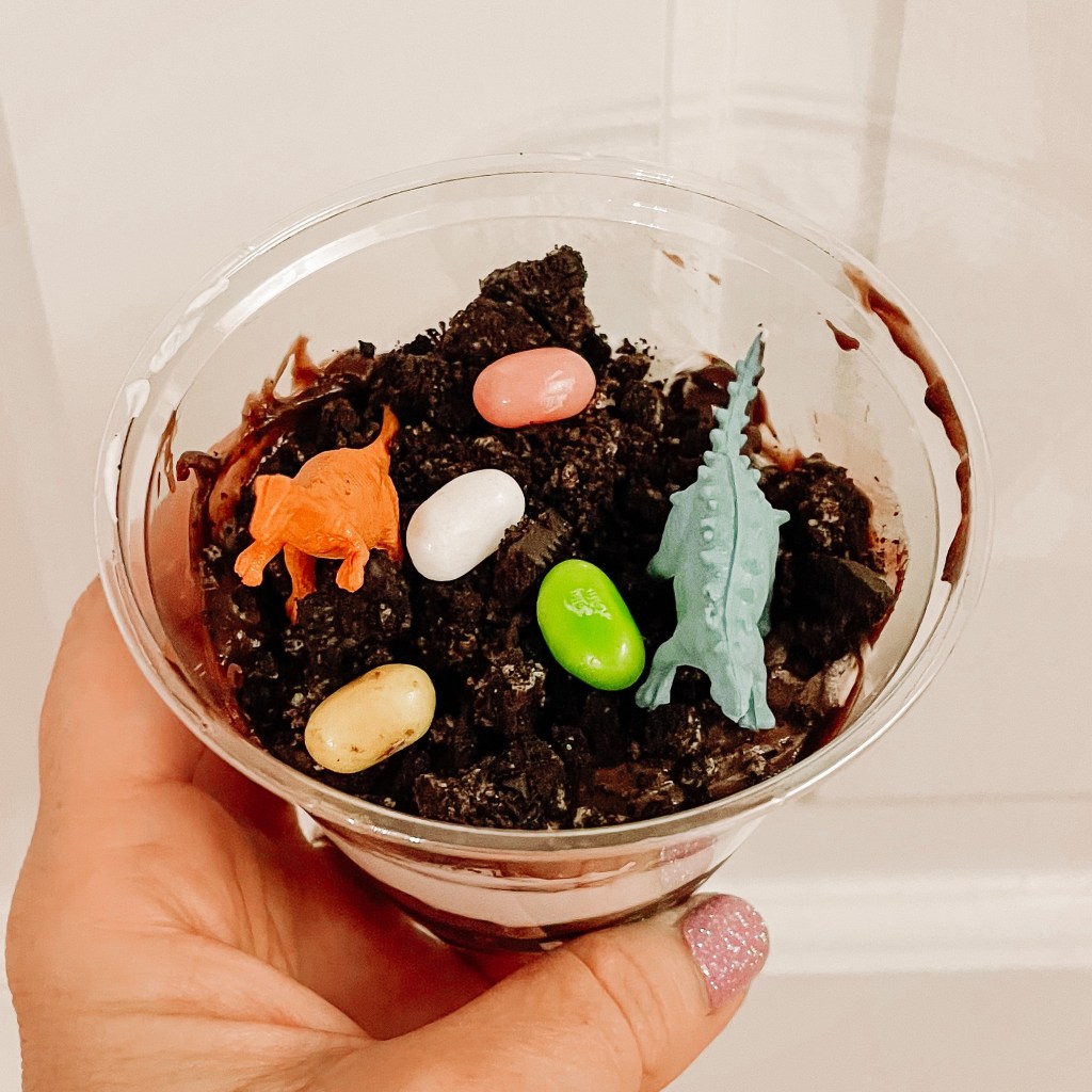 These pudding cups were a HIT. They were a play on dirt cake made with layers instant chocolate pudding and cool whip. The dirt topper is crushed Oreos and then I added Jelly Belly eggs and miniature plastic dinosaurs.