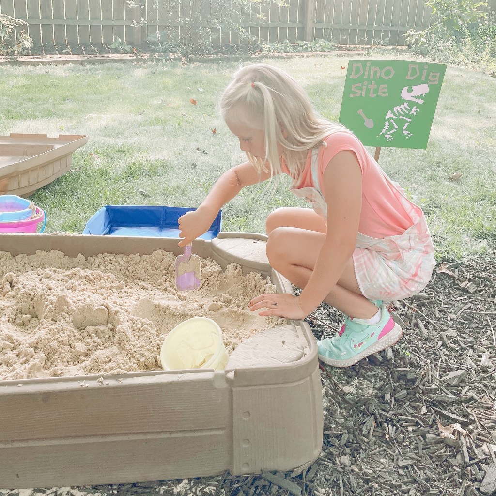 One of the first things I think of when I think about dinosaurs is all of the huge skeletons I see at museums and the paleontologists who uncovered them. So I tossed some extra sand in our sandbox and buried plastic dinosaurs, dinosaur bones, and other little treasures. The kids loved this activity and I’m still finding sand throughout my house (not even going to ask how it got into my basement).
