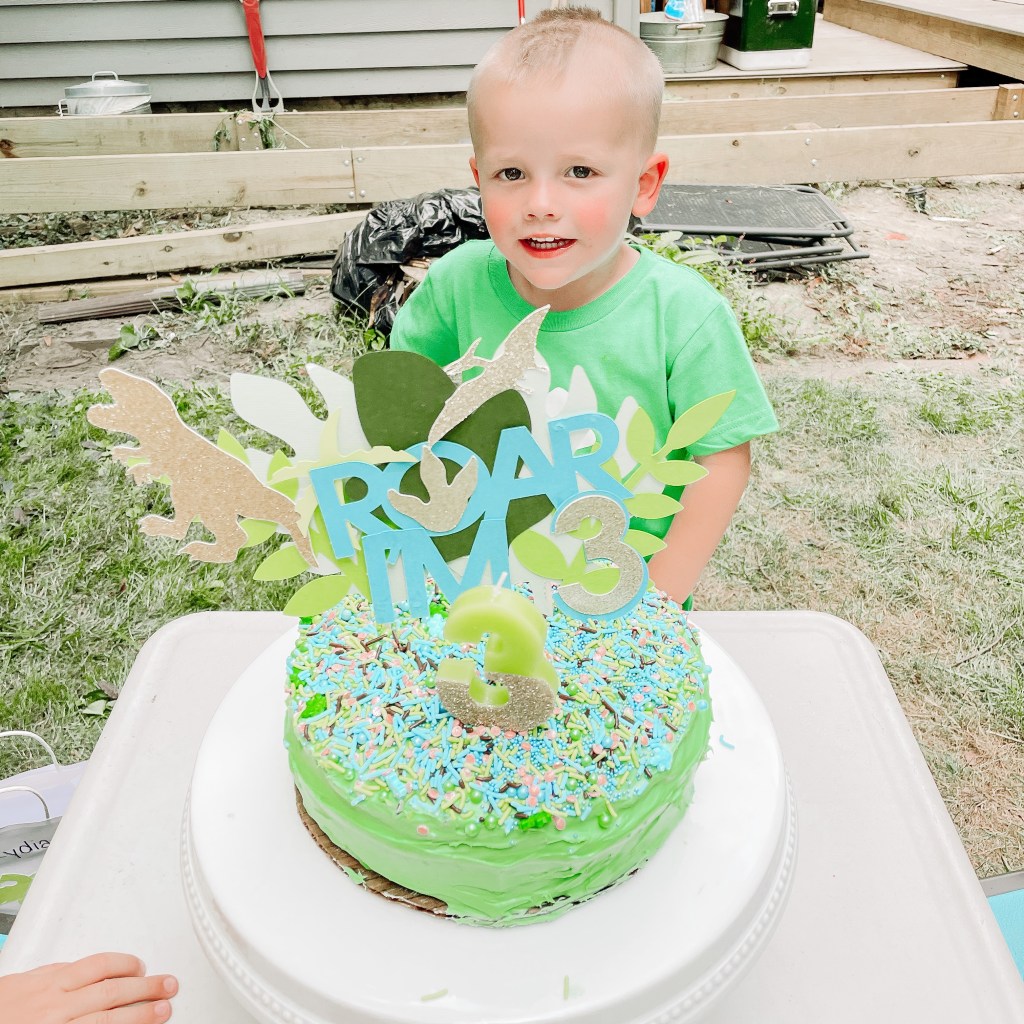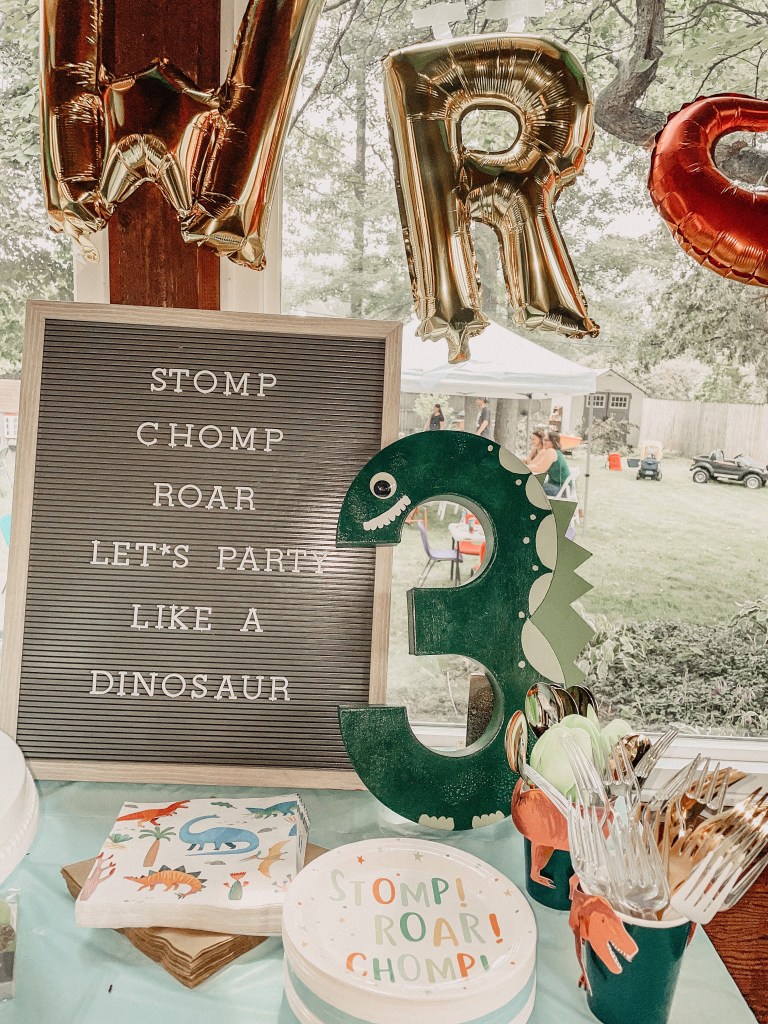 When I came across this centerpiece on Pinterest I knew I had to make it. I love a good DIY and created this “three-asaurus” using a paper mache 3 from hobby lobby, spray paint, acrylic paint and card stock. I put together this Reel on my Instagram of the steps. I placed it on the cake table during the party and now I plan to set it up in his dinosaur-themed bedroom for the next year!