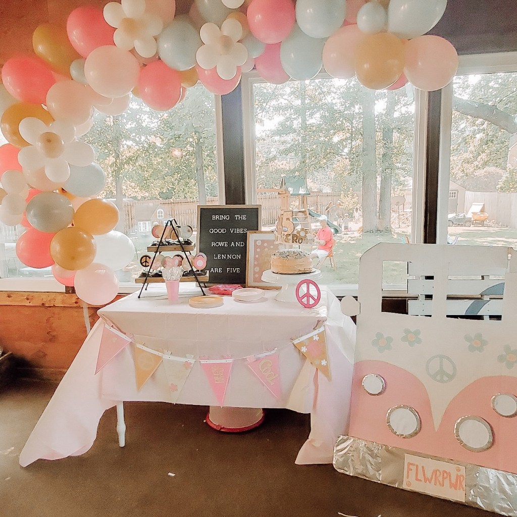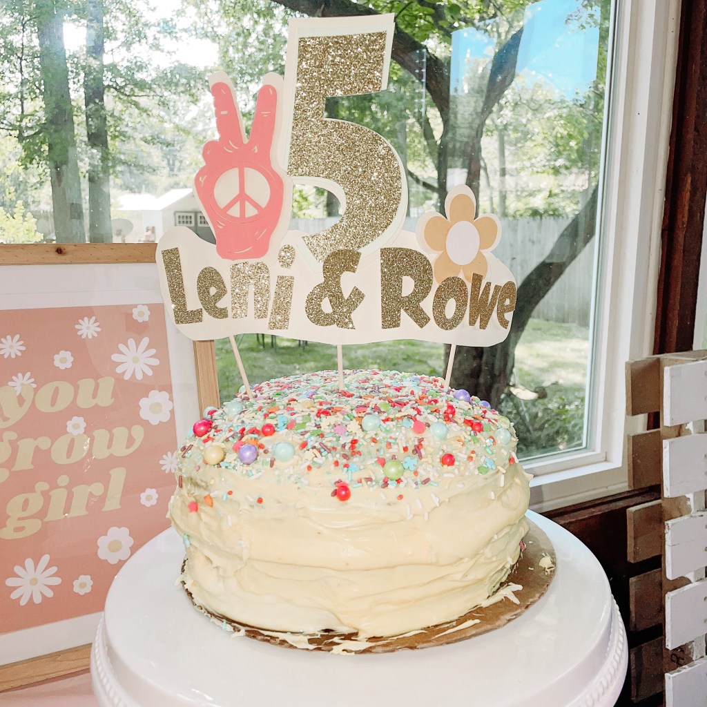 I just threw the grooviest Peace, Love, Party birthday celebration for my girls’ 5th birthday. This was a peace sign toting, hippie at heart’s dream come true. I included everything from smiley faces to daisies and peace signs and even came up with a little rhyme to tie the theme into the girls’ age: Bring the good vibes, Rowe & Leni are 5!