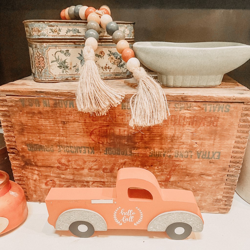 I absolutely love the colors of these wooden beads. They are definitely something I will keep out year round. I shaped it into a sort of loop that I secured in place with a rubber band. They are sitting on top of a vintage tin on the bottom shelf of one of my family room built-ins.