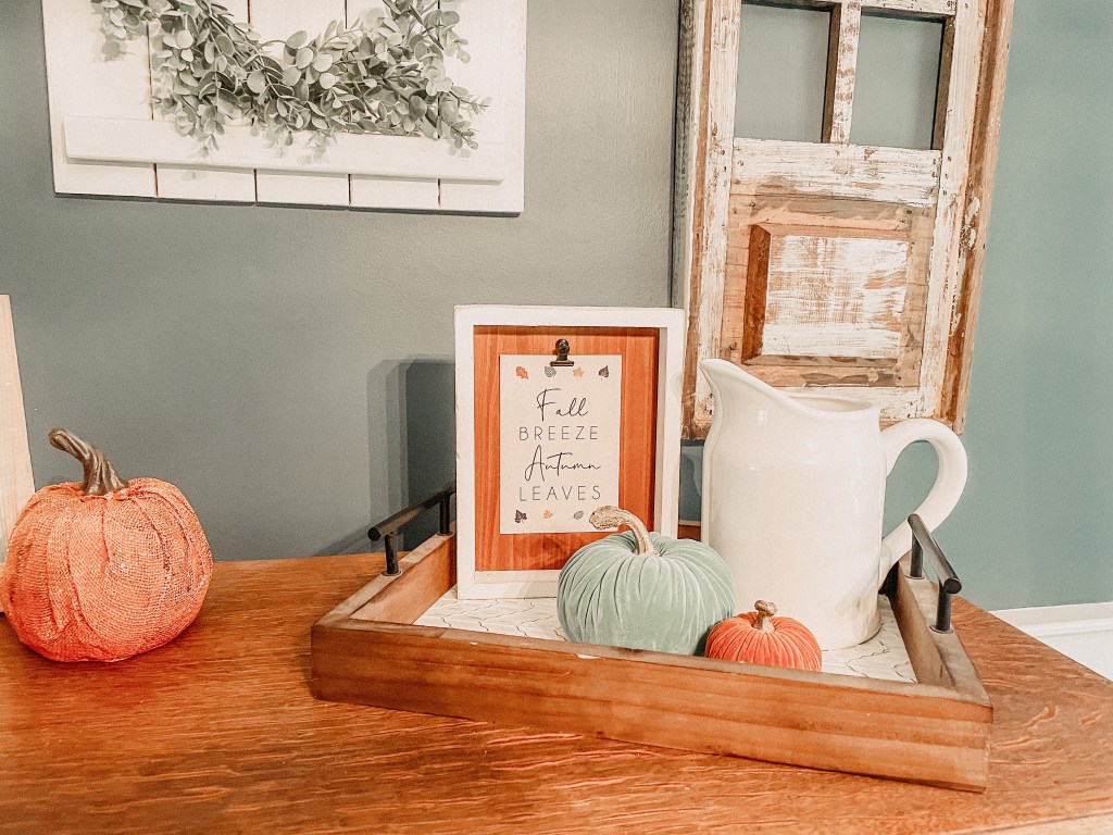 How cute does the art print look on my buffet cabinet? I’ve paired it with a tray from a previous Decocrated box, and the pumpkins from the Fall 2020 Box!