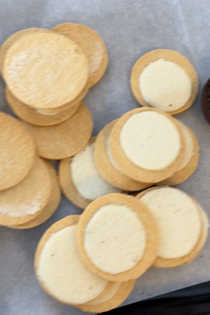 Line a platter or cookie sheet (I’m pretty sure I just heard these are actually called cooking sheets but I’m not ready to make that commitment yet) with parchment paper. Twist your Oreos apart.