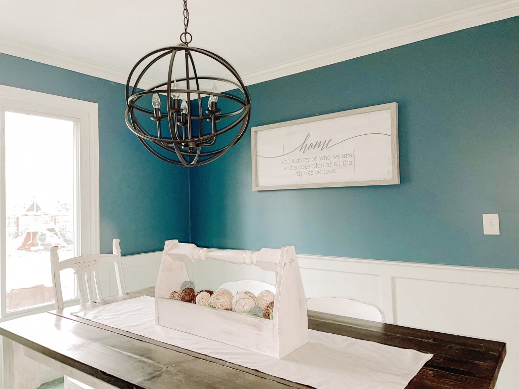 I’ve placed it on my farmhouse dining room table and then on top I’ve filled my wood carrier (not really sure what to call that) with some faux greenery and blue + neutral vase filler.
