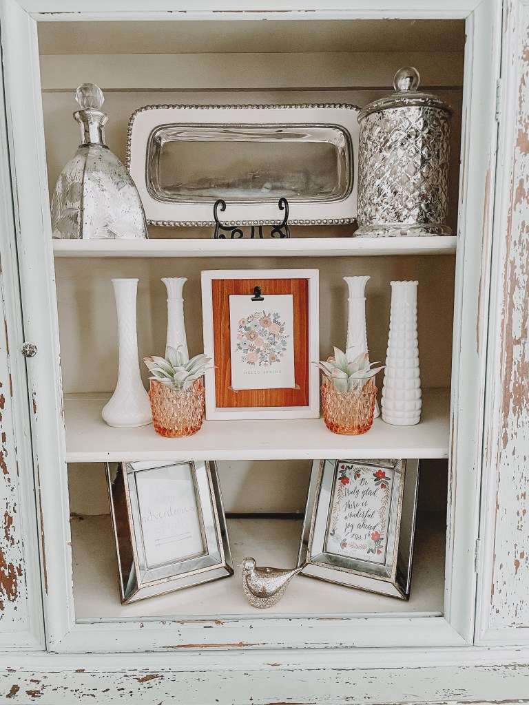 Both sides of this art print are equally beautiful, but I am a sucker for for florals. So that is the side I’ve decided to display (for now anyway). I’ve clipped the print into the wooden frame from a previous Decocrated box and set it up in my vintage cabinet. I think it looks great with my various glass pieces – mercury glass, milk glass, Depression glass…I think it’s safe to say I like glass!