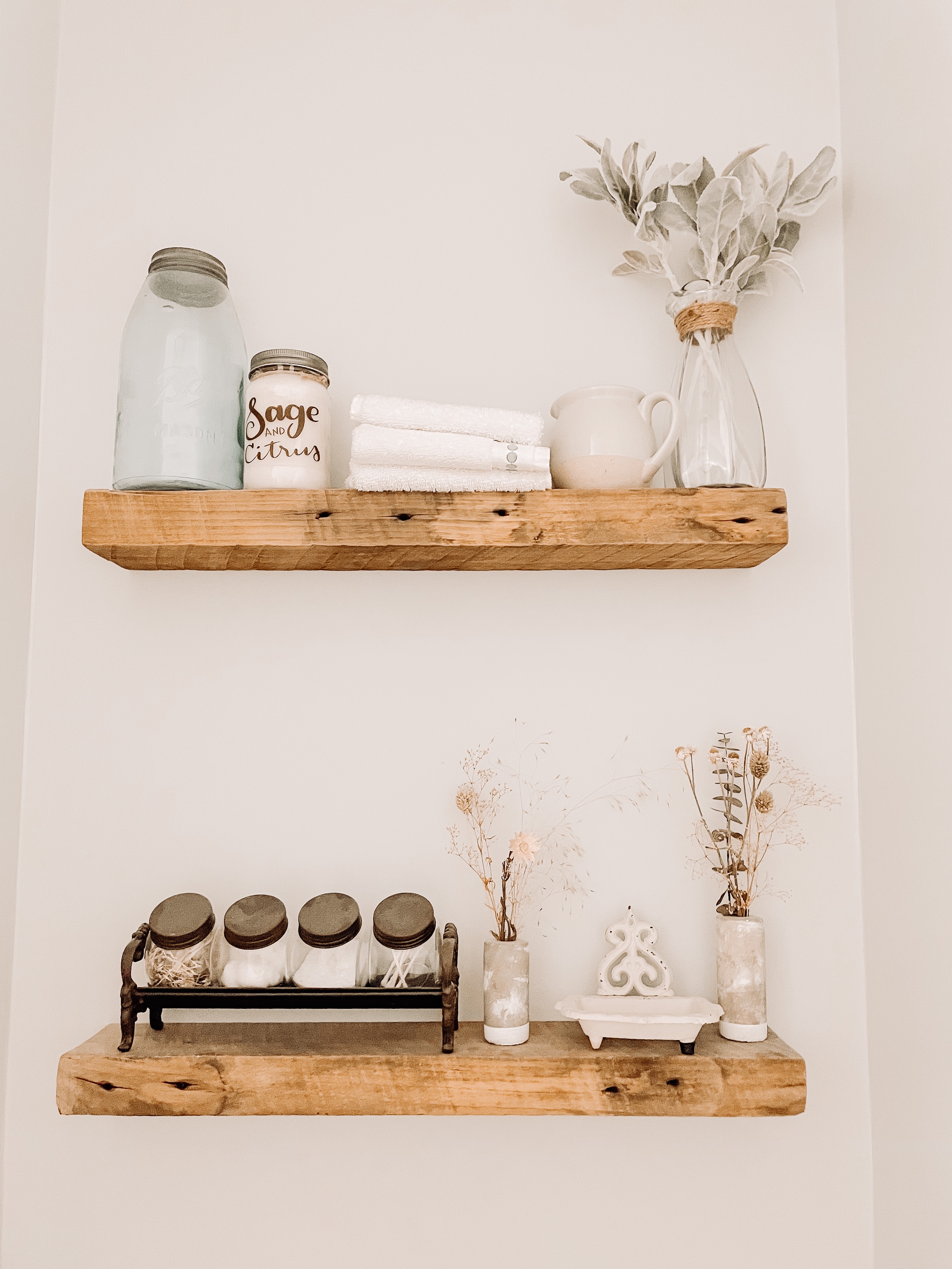 Lamb’s ear is one of my favorite plants. It just seems elegant but also very welcoming, if that makes sense? One of my decor goals is to incorporate more greenery into my decor, and since I can’t seem to keep real plants alive (to which both my mom and mother-in-law can attest) faux plants it is! I decided to arrange them right in the glass vase that was also included in the Spring 2022 Box. I’ve placed them on my wooden shelves in my bathroom and think it looks great.