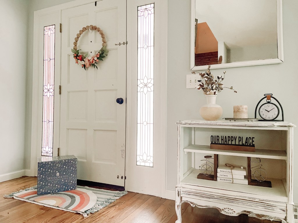 Like I said earlier; the blue color features on the box is perfect for my home. And the blue bead strands were no exception. I decided to place them on my vintage entryway table; one strand around a candle and the other on top of the decorative wooden books. Do you spy all of the Decocrated pieces in this pic?