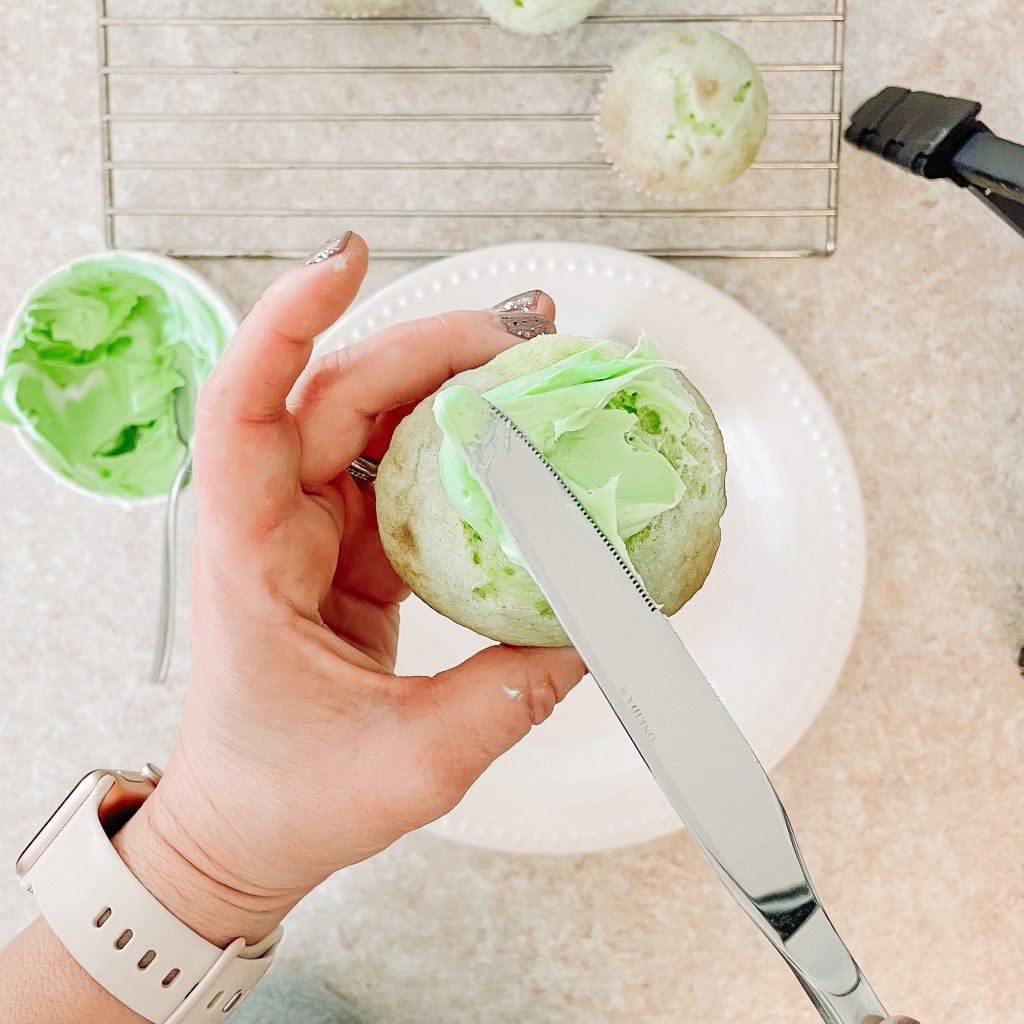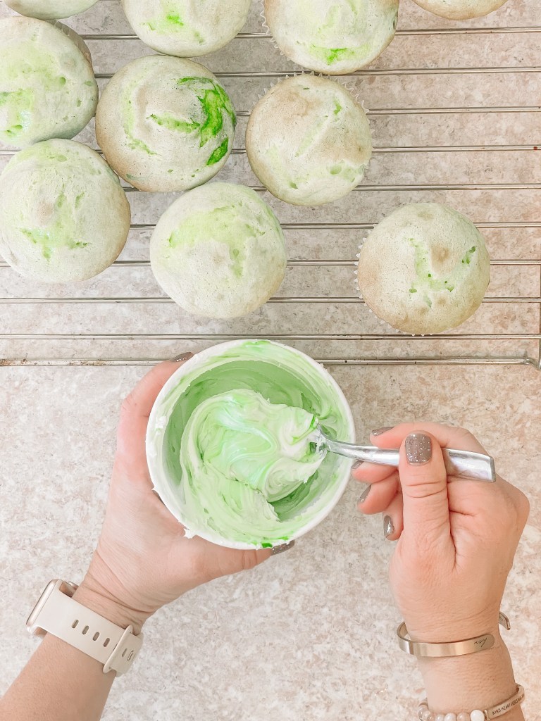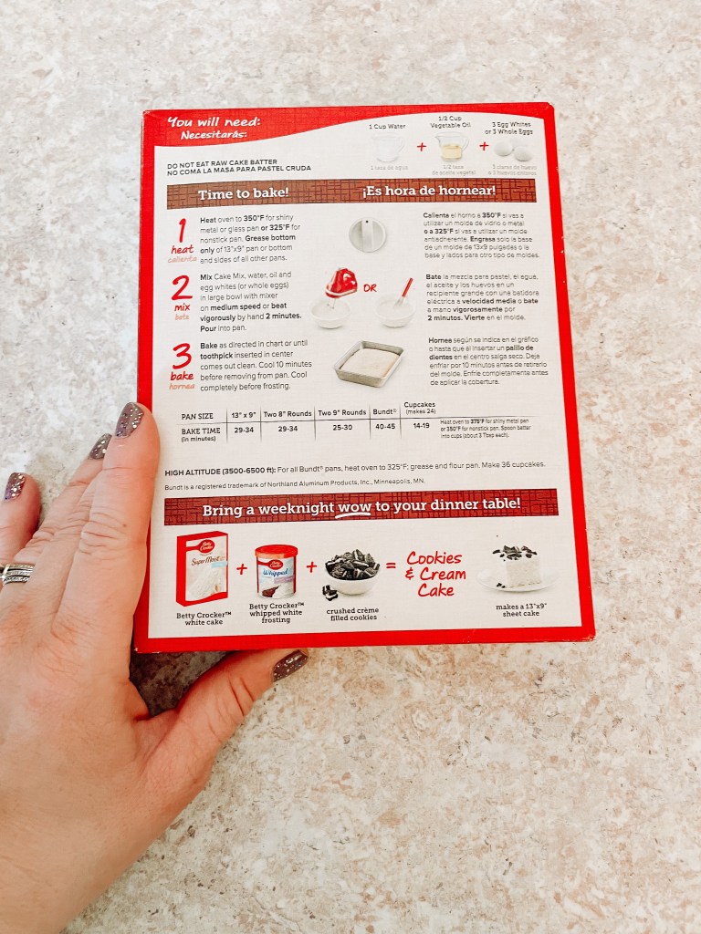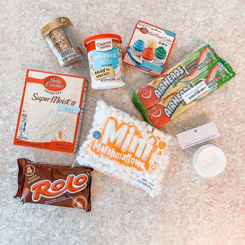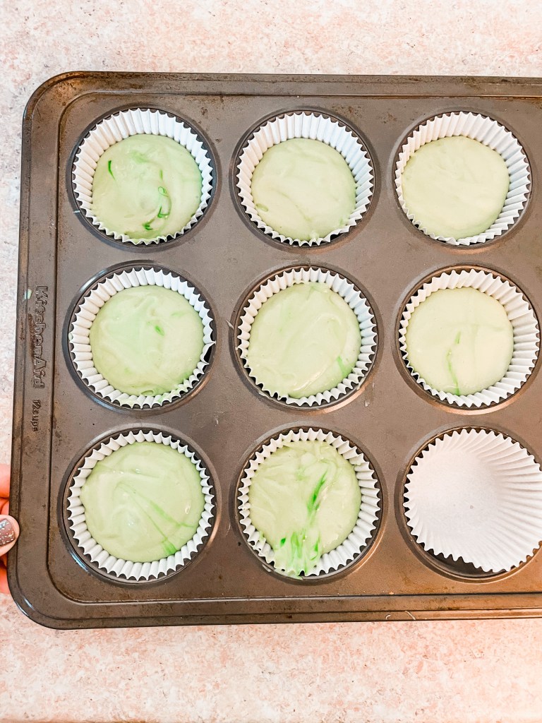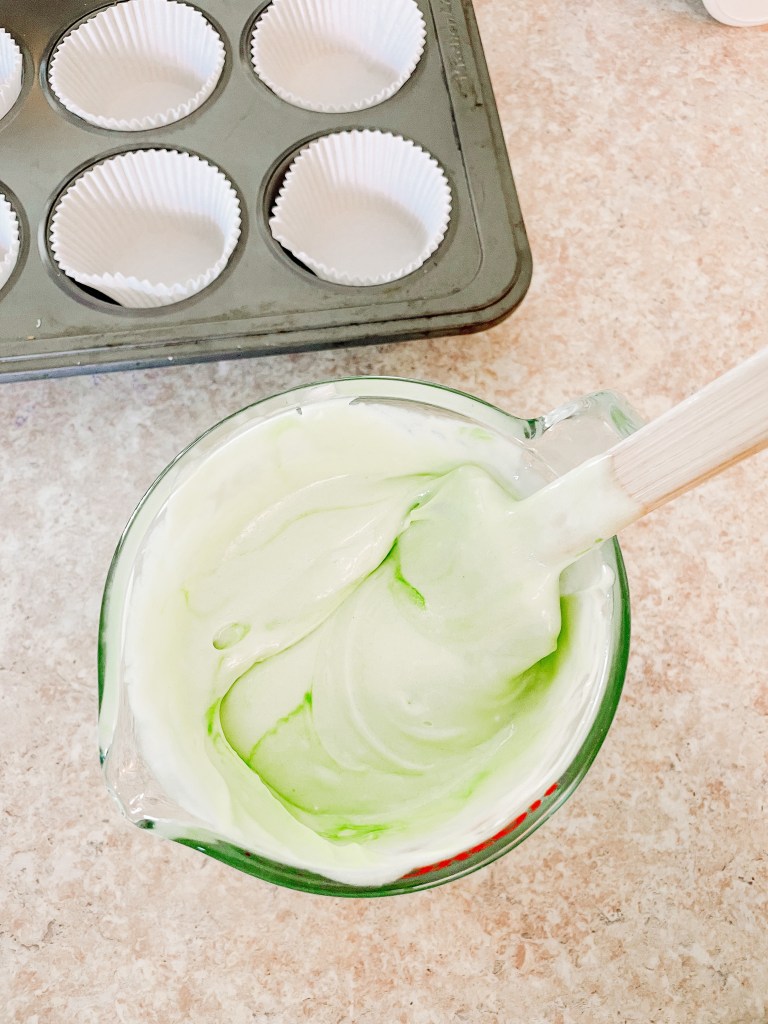 Add cupcake liners to the cupcake tin, spray with oil or pam, and fill ¾ with batter. Bake according to instructions on the box. When finished baking, allow cooling completely.