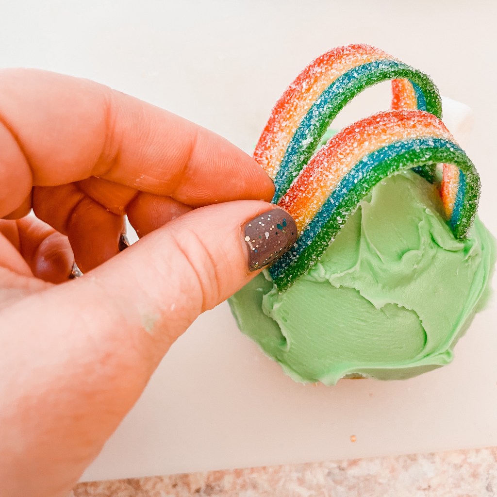 Cut the rainbow airheads in half and place one or two on top of the cupcake in an arch shape. Use the frosting to make sure they stick.