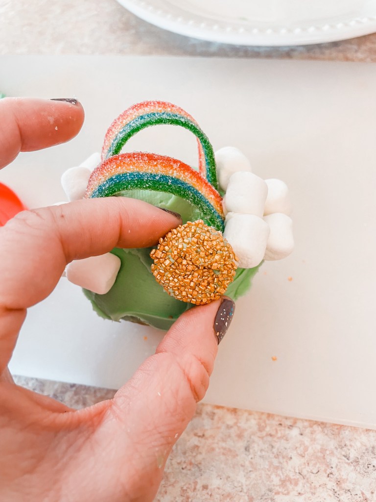 Dip the wide end of a Rolo into frosting and then dip the frosted end into gold sprinkles. Place non-sprinkled end of the Rolo onto the cupcake to look like a pot of gold.