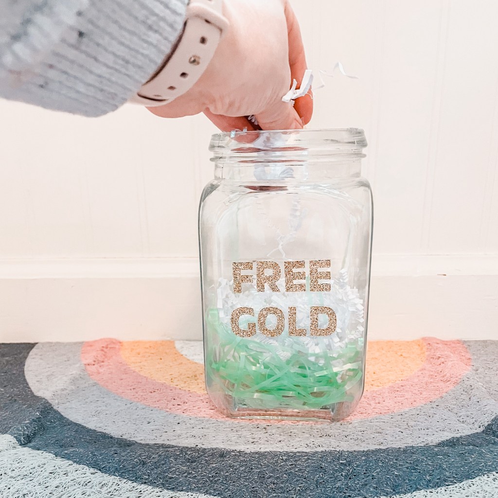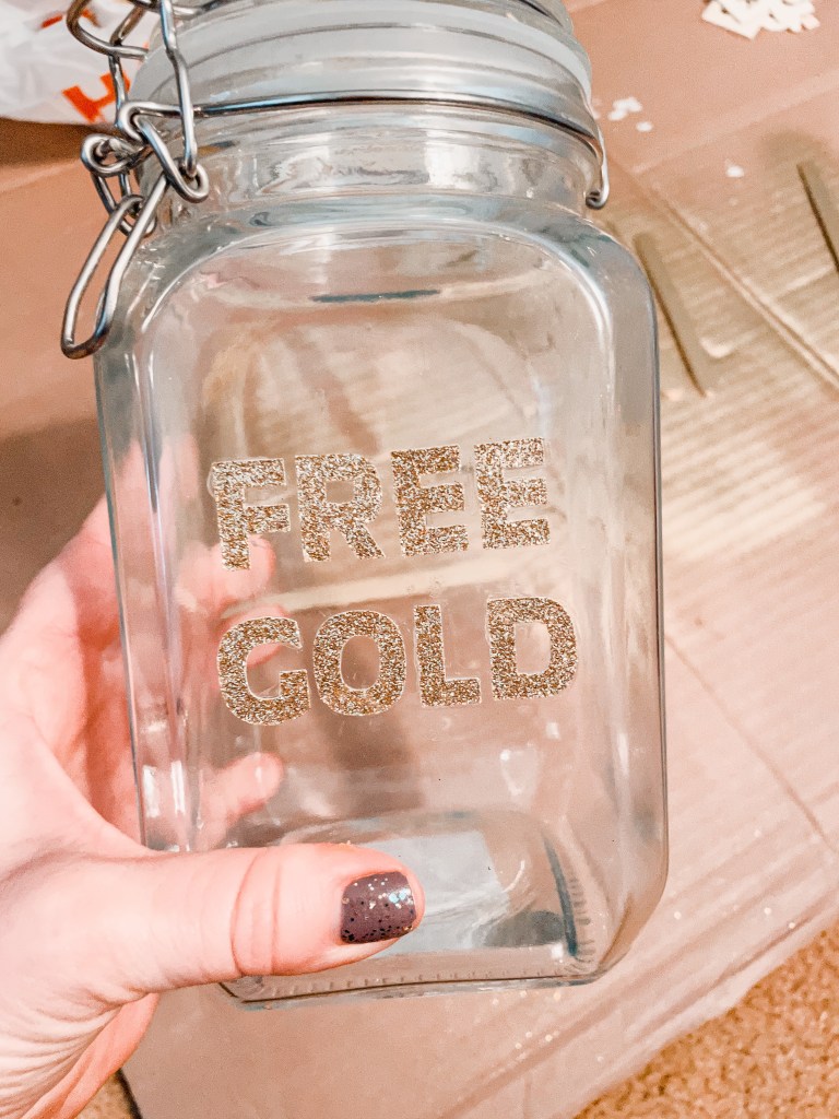 Cut out letters that spell “FREE GOLD” out of the gold paper. Glue the letters to the front of your jar.