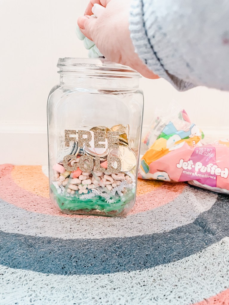 This year I decided to switch it up a bit and toss the construction paper and boxes and go for a more whimsical, pastel rainbow approach. I used a glass canister, paper mache rainbow and Lucky Charms. It turned out adorable and I really think it’s going to lure that leprechaun right in. We can’t wait to see his face once we catch him!