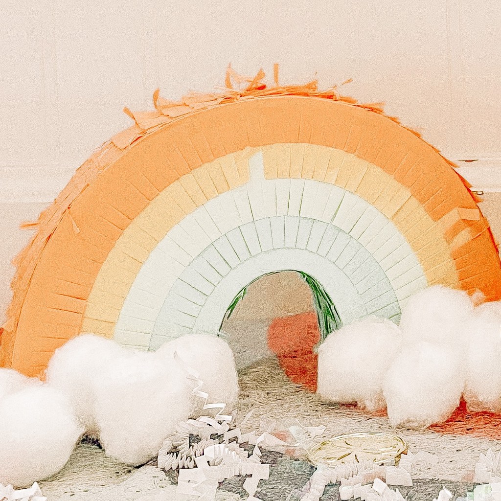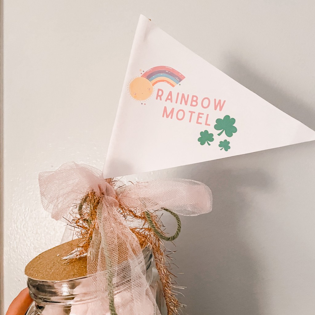 I added this cute Rainbow Motel pennant, a mini rainbow piñata from Target and scattered some gold coins and other sparkly things on the ground around jar to make it look even more enticing to our little pal.
