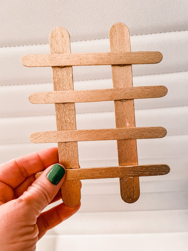 Spray paint several popsicle sticks gold . When dry, glue together to form a ladder.