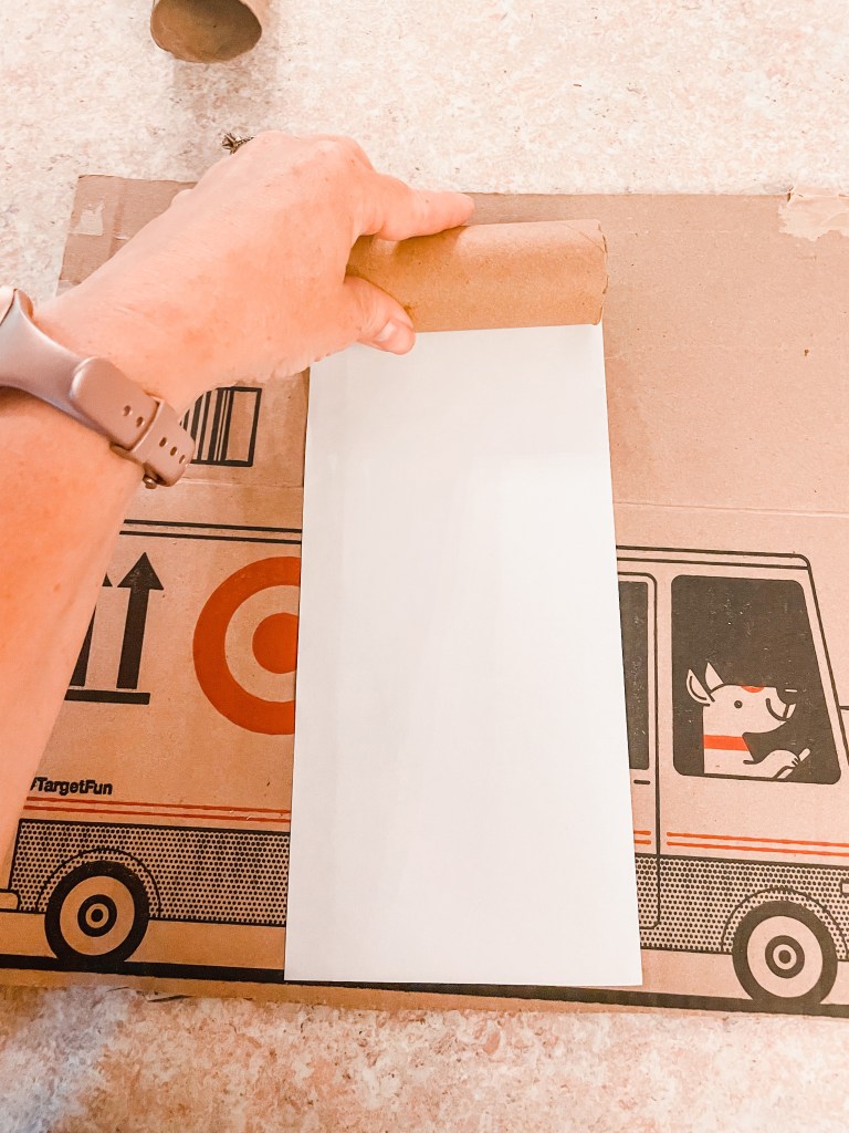Paint the back of the paper with Elmer’s glue. Lay toilet paper roll on top of the glue and roll until the roll is completely covered. Cut off the excess as you should be able to cover another roll with that.