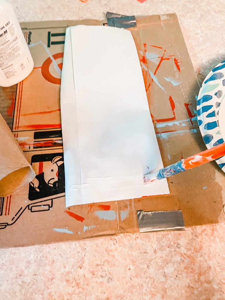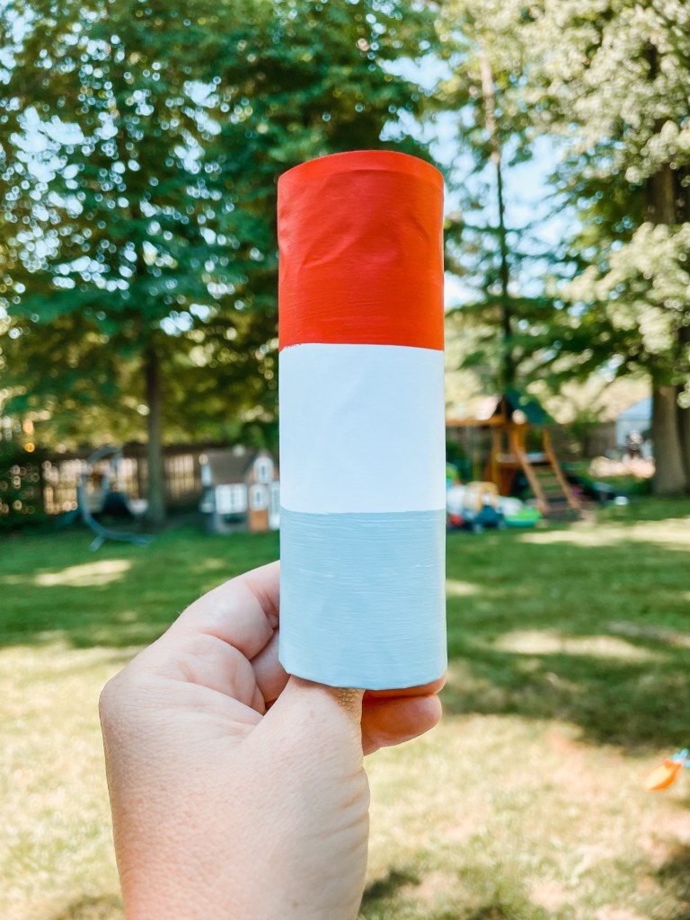 Once dry, glue popsicle stick to the bottom half of the roll (the blue end) so that look like a bomb pop popsicle.