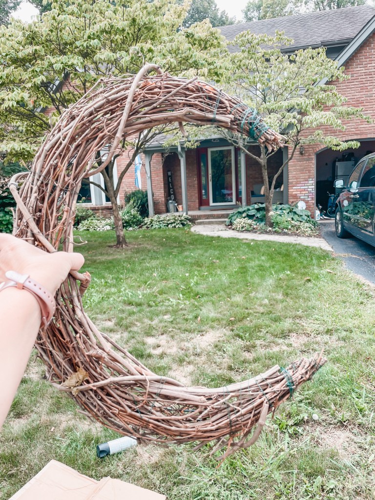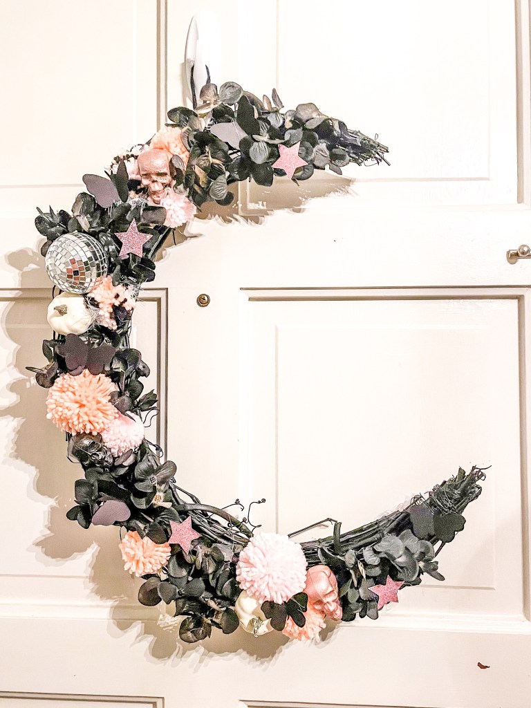 I will not stop until every door in my house has a wreath for every holiday (OK I’m kidding…maybe). But in all seriousness i am wreath obsessed but this time I wanted to step outside the the typical circle wreath and make something a bit different. When I stumbled upon this crescent moon wreath on Pinterest I know I had to create something similar myself.