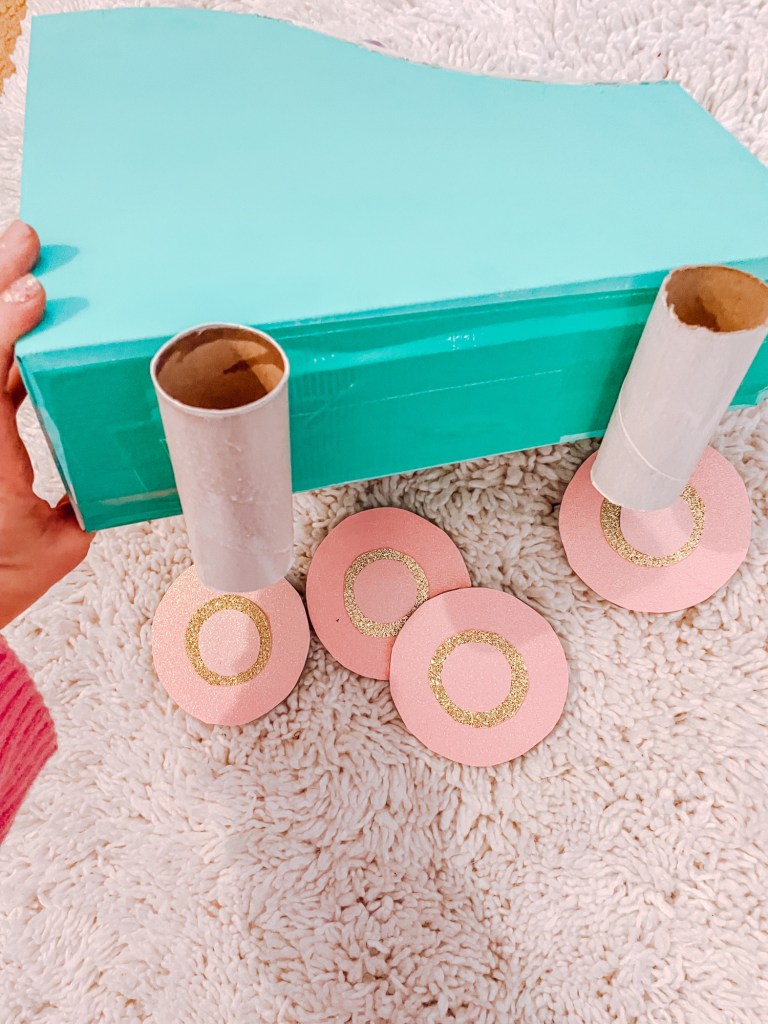 Cut the last toilet paper roll into thirds and paint one of the thirds or cover in paper. This will be your “stopper”. I traced a small cardstock circle the same diameter as one end and glued it to the end. Then I glued the “stopper” below the toe of the skate.