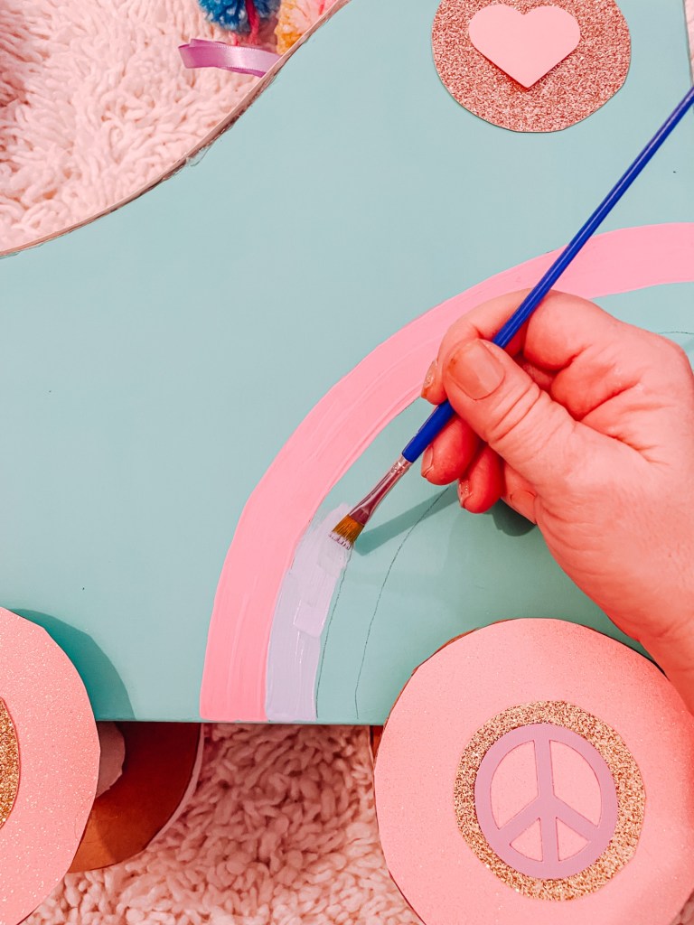 I added peace sign shapes cut on a Cricut to the wheels to make it extra fancy, but you do you!
