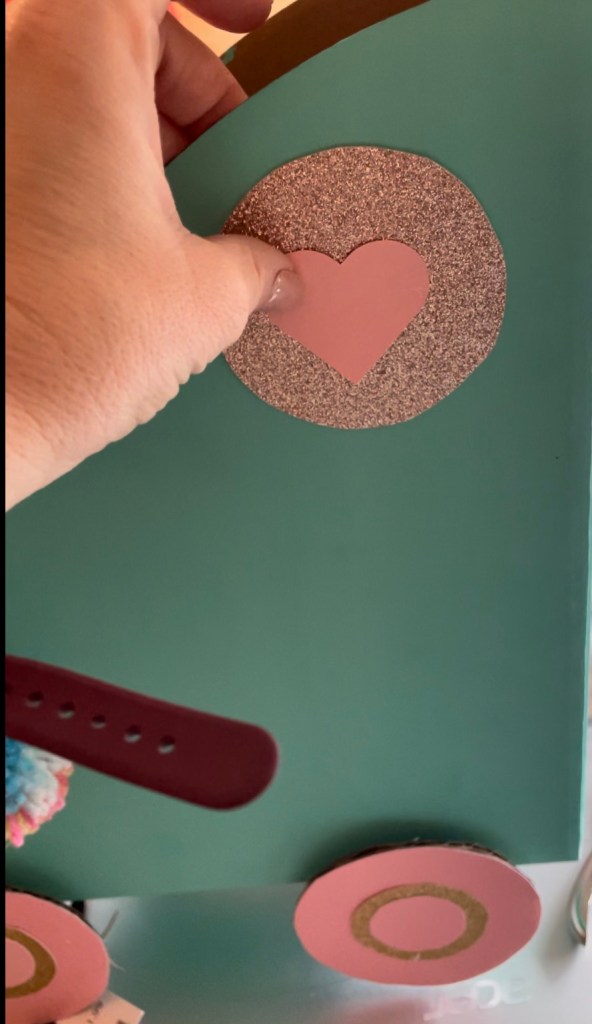Next, cut out two more circles of glitter card stock (size of your liking) and two hearts of solid colored cardstock. Make the hearts small enough to fit within the circle. Glue the hearts onto these circles and then glue the whole thing onto either side of the skate. I placed mine near the top ankle support areas.