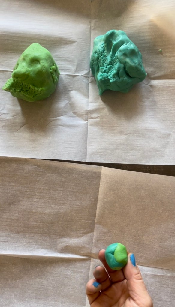 Pinch off pieces of green and blue dough and mold into a ball. Make sure the colors stay distinct and it isn’t just half blue/half green. It should look like the earth/a globe, obviously!