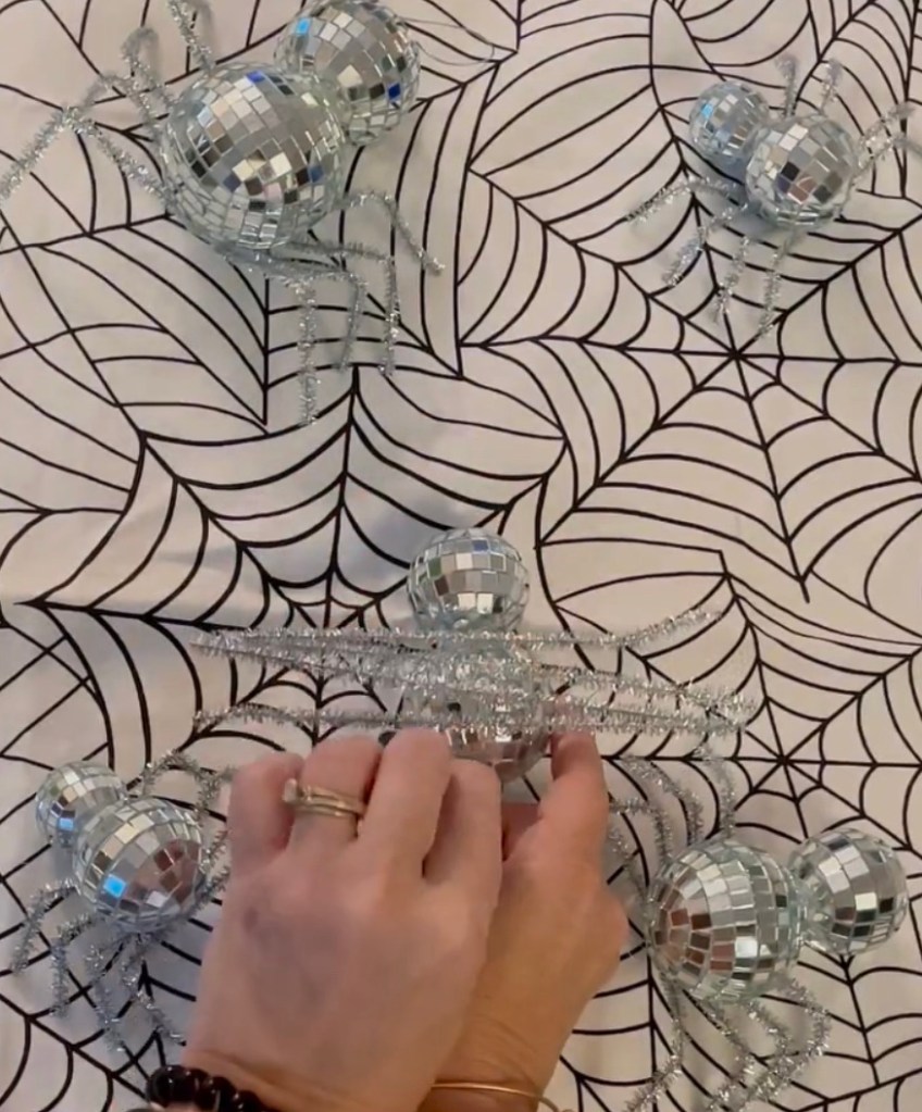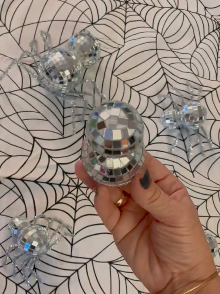 Give me ALLLLL the disco ball decor. This trend is hot and there are so many disco ball decor pieces lining the shelves of my favorite stores. While I did find some rose gold disco ball spiders in the Target Dollar Spot recently, I also wanted some classic silver ones. I already had all the supplies I needed at home since I am a disco ball ornament hoarder, so I whipped up these fantastically creepy spiders in no time.