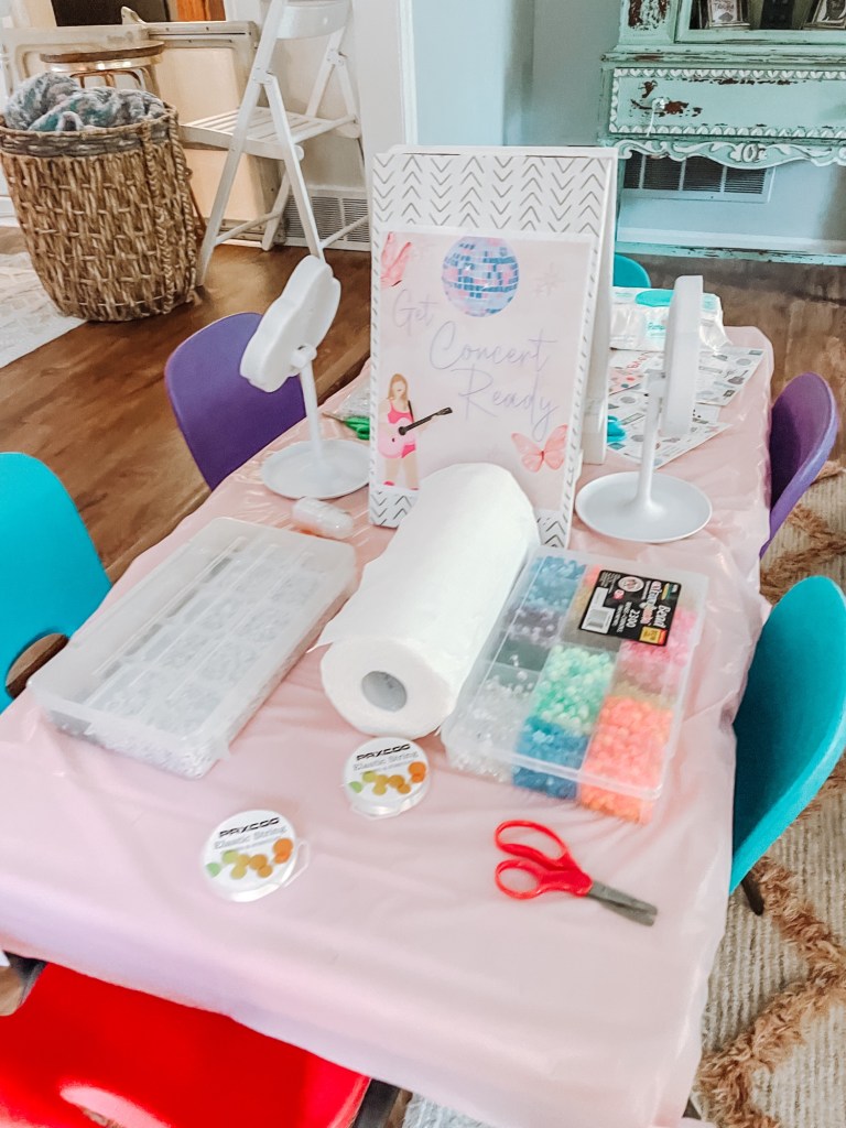 Any Swiftie knows the importance of a friendship bracelet. These tokens are a staple for Eras Tour goers and were essential for our party. I setup a table with a beads in a variety of colors, shapes and sizes. And don’t forget the letter beads for names and phrases! The kids (and adults) had so much fun creating their own, unique bracelets and then wearing them for the rest of the party. We have a ton of beads leftover so I see these being brought out during future playdates and sleepovers.