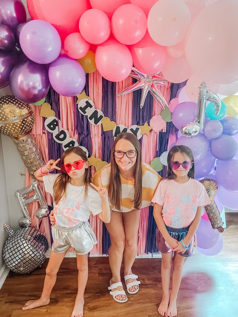 Like with most of my parties, I set up a balloon arch photo backdrop for the kids and other guests to take photos by. I hung some purple and pink DIY fringe backdrops and then added this amazing balloon arch kit from Amazon. Then I added a friendship bracelet -inspired “In My B-day Era” banner created on a Cricut.