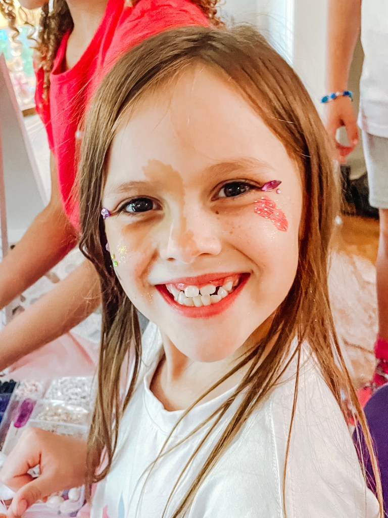 This was my absolute favorite activity from any party I have hosted. I set out Taylor Swift tattoos, fingernail stickers, body glitter and body gems for the kids to put on. We had a couple mirrors to they could see themselves as they got glammed up. It was a HIT and so fun to see all of their personalities come out. Some just applied a few jewels to their faces while others went all out and I am sure are still covered in glitter days later (I know my kids are). Also, this was a requirement if they wanted to sing a Taylor song (more about that in the next activity).