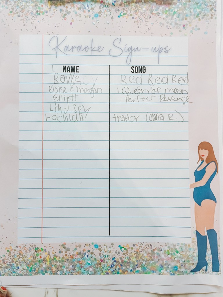 I created a karaoke signup sheet and each of the kids could write down their name and the name of the Taylor song (or by the end of the party it was any song) they wanted to sing. It was so cute to see how a bunch of second graders spelled out song names. They did a good job! The girls (and boys and adults) took turns singing their hearts out for the audience of party-goers. It was so much fun and before I knew it parents were coming to collect their kids. The two hour party was over so quickly, but it was so much fun.