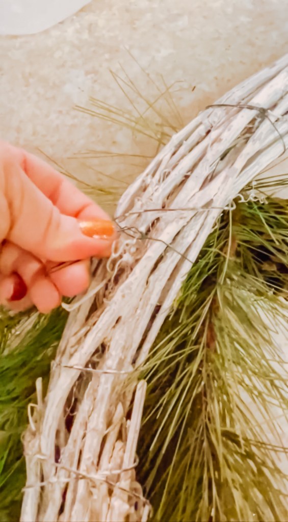 Secure a few of the evergreen stems to the other side of the wreath using floral wire. Leave and open space at the top between the oranges and stems.