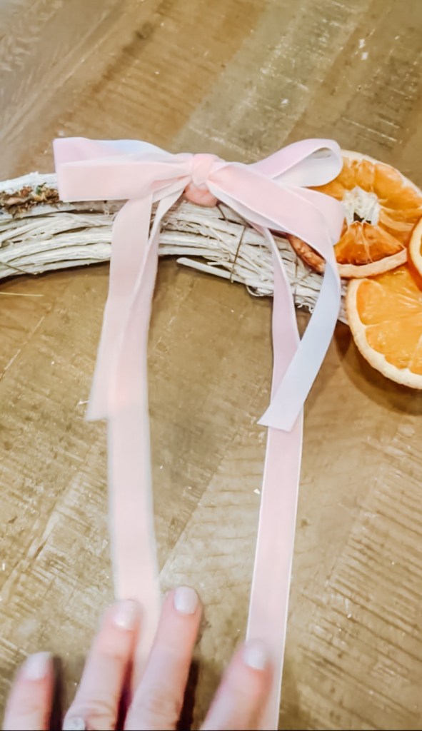Cut a piece of the velvet ribbon, weave it through the wreath (at the top where the oranges stop) and tie it in a bow.