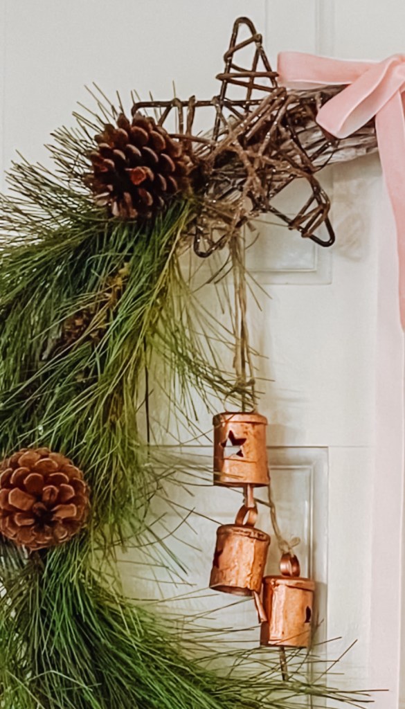 Attach the other end of the string to the wreath so the bells hang down toward the middle/side of the wreath. I tied mine behind the star.