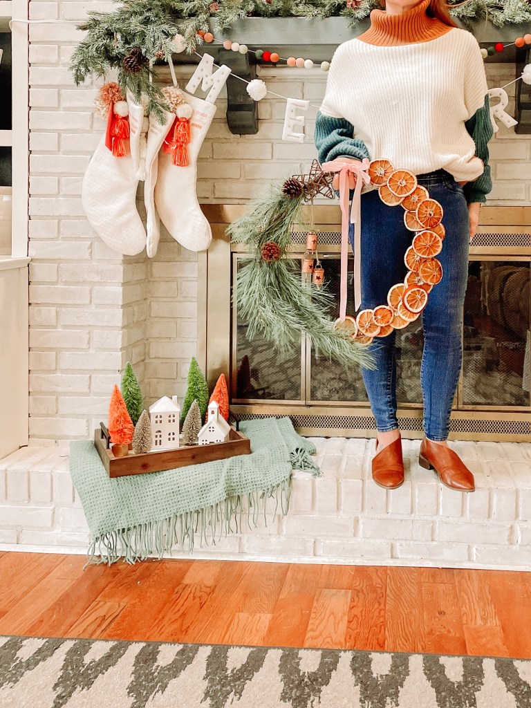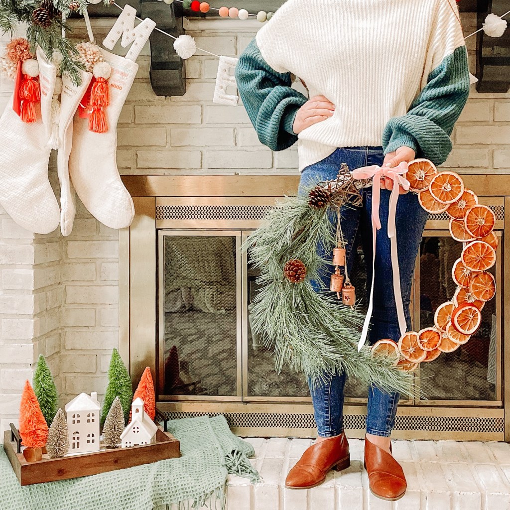 This dried orange holiday wreath can be tweaked to go with any style – classic, farmhouse, whimsical, etc. It’s all in the embellishments and bow color! I chose a pink velvet bow to tie in with the pops of Christmas pink I have throughout my home, and the rose gold bells and white wreath help make it a bit more whimsical and less farmhouse-y.